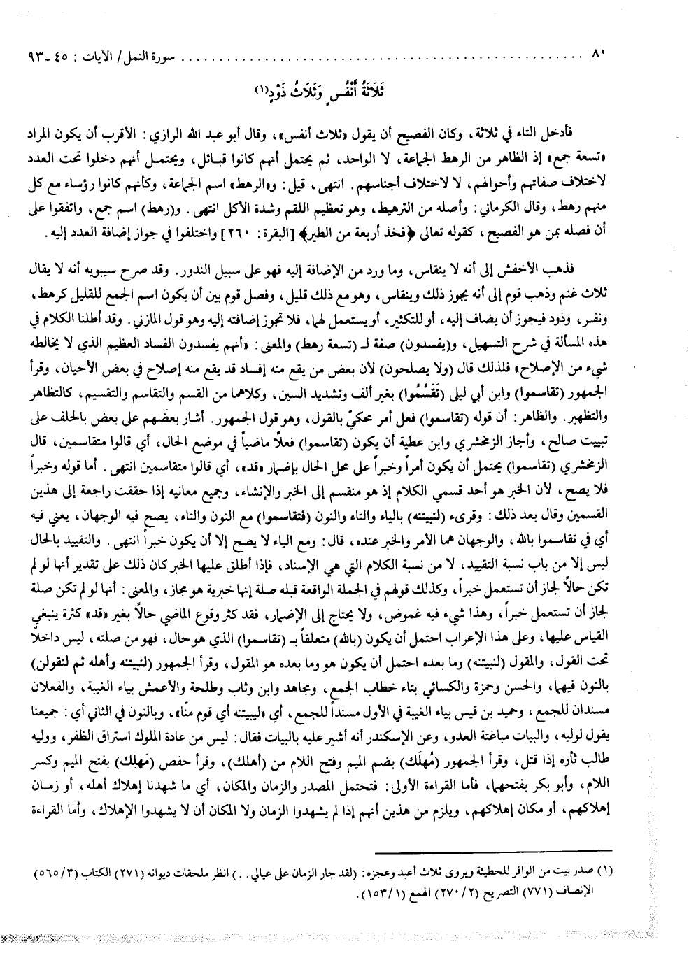 فأدخل التاء في ثلاثة ؛ وكان الفصيح أن يقول : ثلاث أنفس . وقال أبو عبد الله الرازي : الأقرب أن يكون المراد تسعة جمع ، إذ الظاهر من الرهط الجماعة لا الواحد ، ثم يحتمل أنهم كانوا قبائل ، ويحتمل أنهم دخلوا تحت العدد ، لاختلاف صفاتهم وأحوالهم ، لا لاختلاف أجناسهم . انتهى . قيل : والرهط اسم الجماعة ، وكأنهم كانوا رؤساء ، مع كل واحد منهم رهط . وقال الكرماني : وأصله من الترهيط ، وهو تعظيم اللقم وشدة الأكل . انتهى . ورهط : اسم جمع ، واتفقوا على أن فصله بمن هو الفصيح كقوله تعالى : ) فَخُذْ أَرْبَعَةً مّنَ الطَّيْرِ ). واختلفوا في جواز إضافة العدد إليه ، فذهب الأخفش إلى أنه لا ينقاس ، وما ورد من الإضافة إليه فهو على سبيل الندور . وقد صرح سيبويه أنه لا يقال : ثلاث غنم ، وذهب قوم إلى أنه يجوز ذلك وينقاس ، وهو مع ذلك قليل ، وفصل قوم بين أن يكون اسم الجمع للقليل ، كرهط ونفر وذود ، فيجوز أن يضاف إليه ، أو للتكثير ، أو يستعمل لهما ، فلا تجوز إضافته إليه ، وهو قول المازني ، وقد أطلنا الكلام في هذه المسألة في ( شرح التسهيل ) .