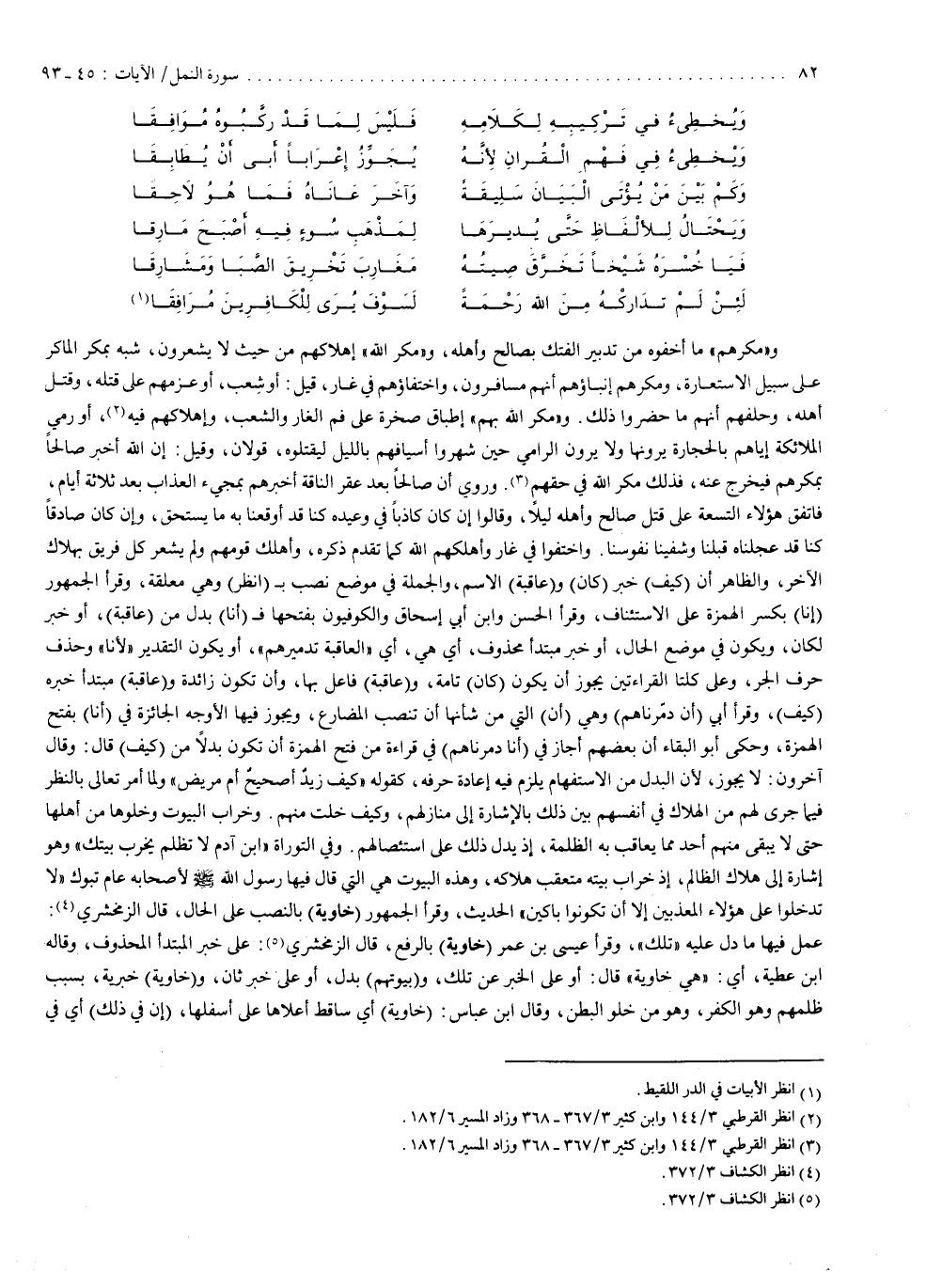 ومكرهم : ما أخفوه من تدبير الفتك بصالح وأهله . ومكر الله : إهلاكهم من حيث لا يشعرون ، شبه بمكر الماكر على سبيل الاستعارة ، ومكرهم : أنبائهم أنهم مسافرون واختفاؤهم في غار . قيل : أو شعب ، أو عزمهم على قتله وقتل أهله ، وحلفهم أنهم ما حضروا ذلك . ومكر الله بهم : إطباق صخرة على فم الغار والشعب وإهلاكهم فيه ، أو رمي الملائكة إياهم بالحجارة ، يرونها ولا يرون الرامي حين شهروا أسيافهم بالليل ليقتلوه ، قولان . وقيل : إن الله أخبر صالحاً بمكرهم فيخرج عنه ، فذلك مكر الله في حقهم . وروي أن صالحاً ، بعد عقر الناقة ، أخبرهم بمجيء العذاب بعد ثلاثة أيام ، فاتفق هؤلاء التسعة على قتل صالح وأهله ليلاً وقالوا : إن كان كاذباً في وعيده ، كنا قد أوقعنا به ما يستحق ؛ وإن كان صادقاً ، كنا قد عجلناه قبلنا وشفينا نفوسنا . واختفوا في غار ، وأهلكم الله ، كما تقدم ذكره ، وأهلك قومهم ، ولم يشعر كل فريق بهلاك الآخر . والظاهر أن كيف خبر كان ، وعاقبة الاسم ، والجملة في موضع نصب بانظر ، وهي معلقة ، وقرأ الجمهور : إنا ، بكسر الهمزة على الاستئناف . وقرأ الحسن ، وابن أبي إسحاق ، والكوفيون : بفتحها ، فأنا بدل من عاقبة ، أو خبر لكان ، ويكون في موضع الحال ، أو خبر مبتدأ محذوف ، أي هي ، أي العاقبة تدميرهم . أو يكون التقدير : لأنا وحذف حرف الجر . وعلى كلتا القراءتين يجوز أن يكون ) كَانَ ( تامة و ) عَاقِبَةُ ( فاعل بها ، وأن تكون زائدة وعاقبة مبتدأ خبره ) كَيْفَ ). وقرأ أبي : أن دمّرناهم ، وهي أن التي من شأنها أن تنصب المضارع ، ويجوز فيها الأوجه الجائزة في أنا ، بفتح الهمزة . وحكى أبو البقاء : أن بعضهم أجاز في ) أَنَّا دَمَّرْنَاهُمْ ( في قراءة من فتح الهمزة أن تكون بدلاً من كيف ، قال : وقال آخرون : لا يجوز ، لأن البدل من الاستفهام يلزم فيه إعادة حرفه ، كقوله : كيف زيد ، أصحيح أم مريض ؟