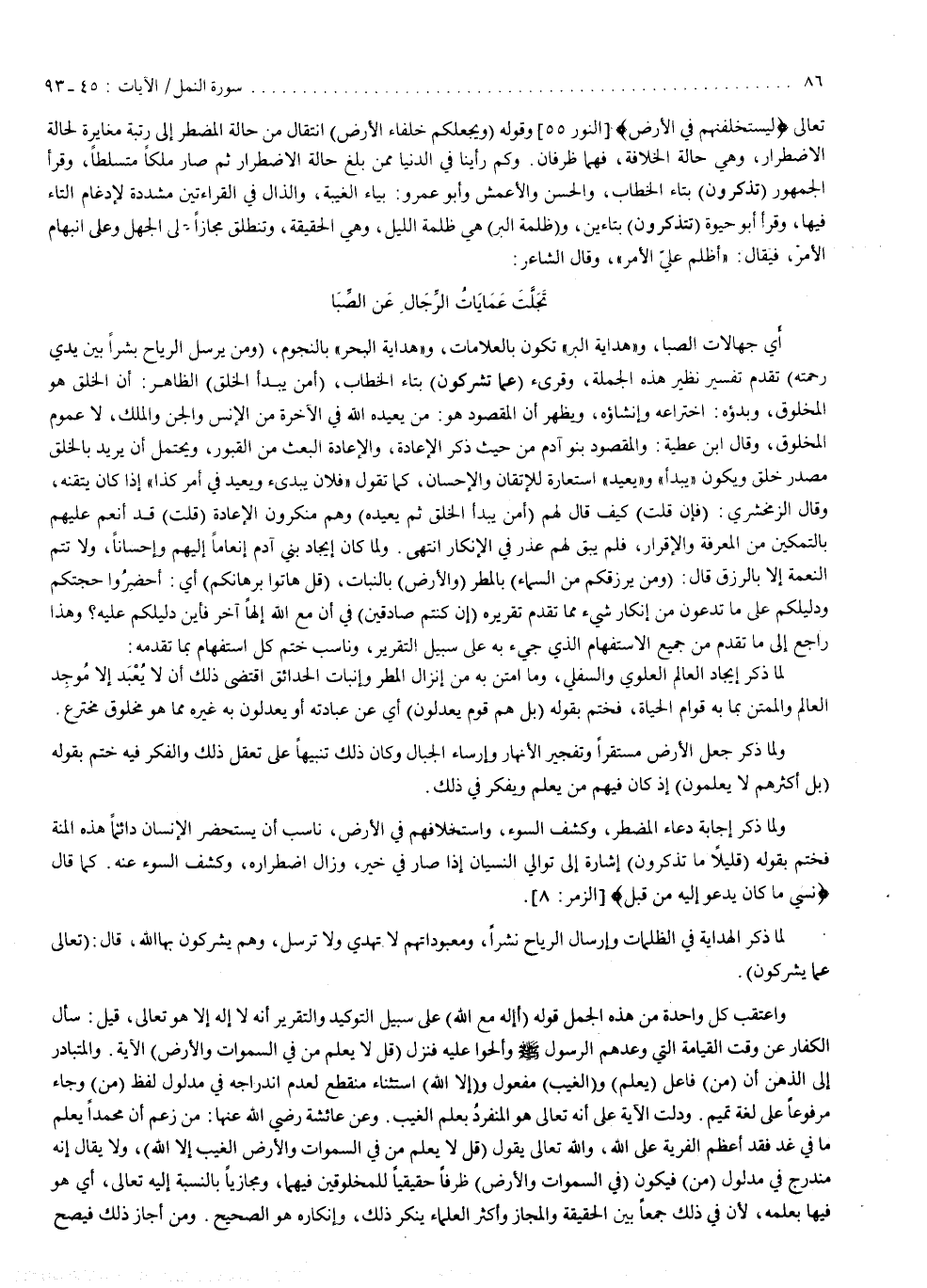 لما ذكر إيجاد العالم العلوي والسفلي ، وما امتن به من إنزال المطر وإنبات الحدائق ، اقتضى ذلك أن لا يعبد إلا موجد العالم والممتن بما به قوام الحياة ، فختم بقوله : ) بَلْ هُمْ قَوْمٌ يَعْدِلُونَ ( ، أي عن عبادته ، أو يعدلون به غيره مما هو مخلوق مخترع . ولما ذكر جعل الأرض مستقراً ، وتفجير الأنهار ، وإرساء الجبال ، وكان ذلك تنبيهاً على تعقل ذلك والفكر فيه ، ختم بقوله : ) بَلْ أَكْثَرُهُمْ لاَ يَعْلَمُونَ ( ، إذ كان فيهم من يعلم ويفكر في ذلك . ولما ذكر إجابة دعاء المضطر ، وكشف السوء ، واستخلافهم في الأرض ، ناسب أن يستحضر الإنسان دائماً هذه المنة ، فختم بقوله : قليلاً ما تذكرون ، إشارة إلى توالي النسيان إذا صار في خير وزال اضطراره وكشف السوء عنه ، كما قال : ) نَسِىَ مَا كَانَ يَدْعُو إِلَيْهِ مِن قَبْلُ ). ولما ذكر الهداية في الظلمات ، وإرسال الرياح نشراً ، ومعبوداتهم لا تهدي ولا ترسل ، وهم يشركون بها الله ، قال تعالى : ) عَمَّا يُشْرِكُونَ ). واعتقب كل واحدة من هذه الجمل قوله : ) مَّعَ الله بَلْ ( ، على سبيل التوكيد والتقرير أنه لا إله إلا هو تعالى .