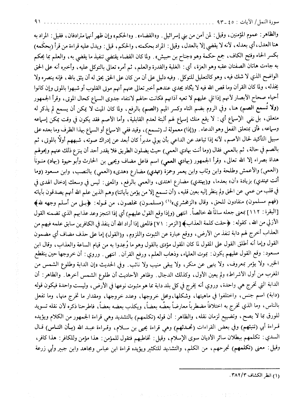 شبههم أولاً بالموتى ، ثم بالصم في حالة ، ثم بالعمي ، فقال : ) وَمَا أَنتَ بِهَادِى الْعُمْىِ ( حيث يضلون الطريق ، فلا يقدر أحد أن ينزع ذلك عنهم ويحولهم هداة بصراء إلا الله تعالى . وقرأ الجمهور : بهادي العمى ، اسم فاعل مضاف ؛ ويحيى بن الحارث ، وأبو حيوة : بهادٍ ، منوناً العمي ؛ والأعمش ، وطلحة ، وابن وثاب ، وابن يعمر ، وحمزة : تهدي ، مضارع هدي ، العمي بالنصب ؛ وابن مسعود : وما أنت تهتدي ، بزيادة أن بعد ما ، ويهتدي مضارع اهتدى ، والعمي بالرفع ، والمعنى : ليس في وسعك إدخال الهدى في قلب من عمي عن الحق ولم ينظر إليه بعين قلبه . ) وَمَا أَنتَ بِهَادِى الْعُمْىِ عَن ضَلَالَتِهِمْ ( ، وهم الذين علم الله أنهم يصدقون بآياته . ) فَهُم مُّسْلِمُونَ ( : منقادون للحق . وقال الزمخشري : مسلمون مخلصون ، من قوله : ) بَلَى مَنْ أَسْلَمَ وَجْهَهُ لِلَّهِ ( ، بمعنى جعله سالماً لله خالصاً . انتهى .