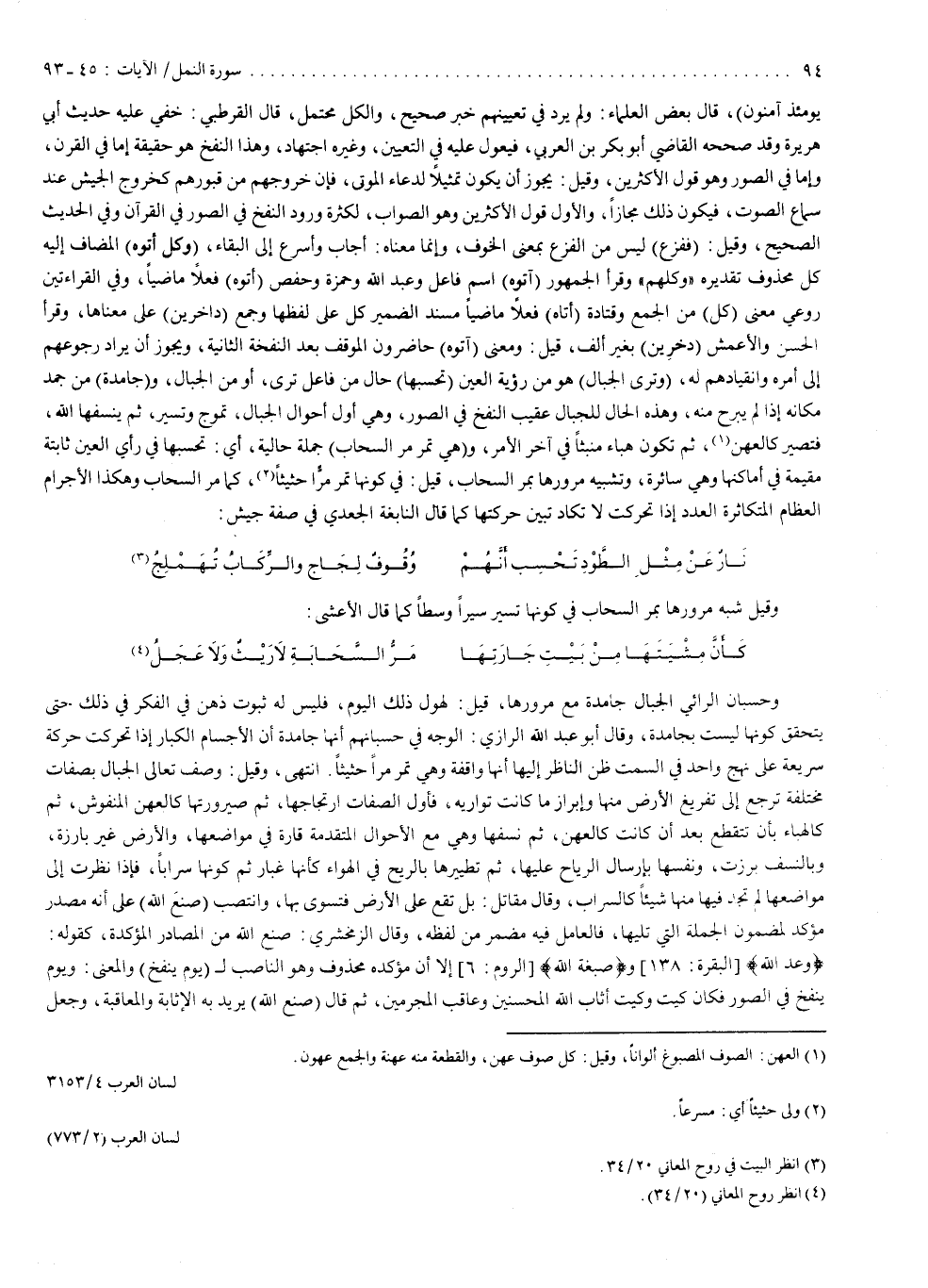 ( وَكُلٌّ أَتَوْهُ ( : المضاف إليه كل محذوف تقديره : وكلهم . وقرأ الجمهور : آتوه ، اسم فاعل ؛ وعبد الله ؛ وحمزة ، وحفص : أتوه ، فعلاً ماضياً ، وفي القراءتين روعي معنى كل من الجمع ، وقتادة : أتاه ، فعلاً ماضياً مسنداً الضمير كل على لفظها ، وجمع داخرين على معناها . وقرأ الحسن ، والأعمش : دخرين ، بغير ألف . قيل : ومعنى آتوه : حاضرون الموقف بعد النفخة الثانية ، ويجوز أن يراد رجوعهم إلى أمره وانقيادهم له . ) وَتَرَى الْجِبَالَ ( : هو من رؤية العين تحسبها حال من فاعل ترى ، أو من الجبال . وجامدة ، من جمد مكانه إذا لم يبرح منه ، وهذه الحال للجبال عقيب النفخ في الصور ، وهي أول أحوال الجبال ، تموج وتسير ، ثم ينسفها الله فتصير كالعهن ، ثم تكون هباء منبثاً في آخر الأمر . ) وَهِىَ تَمُرُّ مَرَّ السَّحَابِ ( : جملة حالية ، أي تحسبها في رأي العين ثابتة مقيمة في أماكنها وهي سائرة ، وتشبيه مرورها بمر السحاب . قيل : في كونها تمر مراً حثيثاً ، كما مر السحاب ، وهكذا الأجرام العظام المتكاثرة العدد ، إذا تحركت لا تكاد تبين حركتها ، كما قال النابغة الجعدي في صفة جيش : نار عن مثل الطود تحسب أنهم