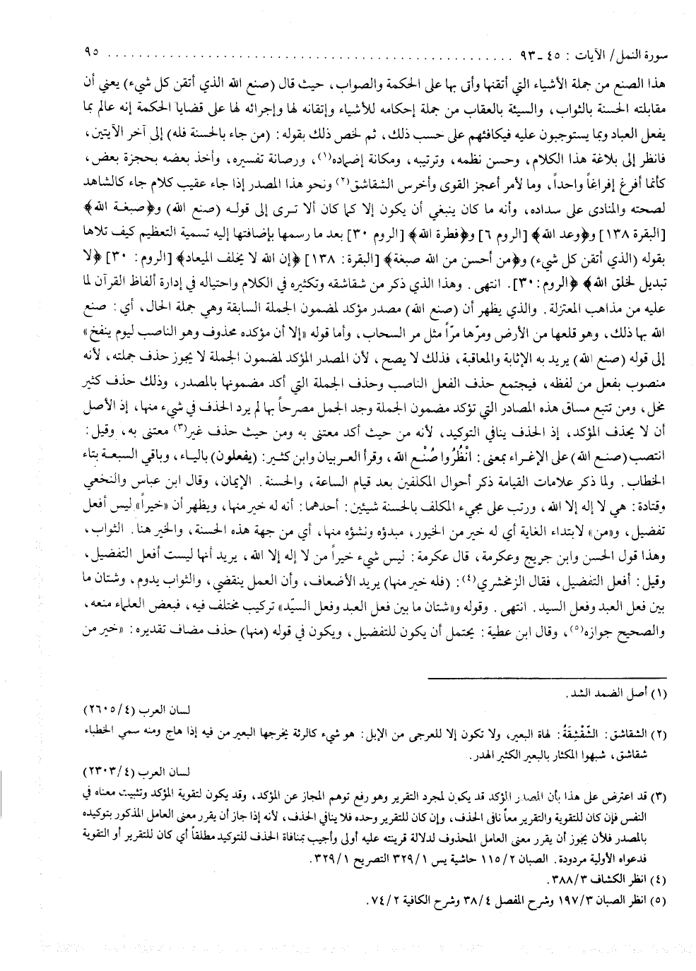 هذا الصنع من جملة الأشياء التي أتقنها وأتى بها على الحكمة والصواب ، حيث قال : ) صُنْعَ اللَّهِ الَّذِى أَتْقَنَ كُلَّ شَىْء ( ، يعني ؛ أن مقابلته الحسنة بالثواب ، والسيئة بالعقاب ، من جملة أحكامه للأشياء وإتقانه لها واجرائه لها على قضايا الحكمة أنه عالم بما يفعل العباد ، وبما يستوجبون عليه ، فيكافئهم على حسب ذلك . ثم لخص ذلك بقوله : ) مَن جَاء بِالْحَسَنَةِ فَلَهُ ( ، إلى آخر الآيتين . فانظر إلى بلاغة هذا الكلام ، وحسن نظمه وترتيبه ، ومكانة إضماده ، ورصانة تفسيره ، وأخذ بعضه بحجزة بعض ، كأنما أفرغ إفراغاً واحداً ، وما لأمر أعجز القوى وأخرس الشقاشق ، ونحو هذا المصدر ، إذا جاء عقيب كلام ، جاء كالشاهد لصحته ، والمنادى على سداده ، وأنه ما كان ينبغي أن يكون إلا كما كان . ألا ترى إلى قوله : ) صُنْعَ اللَّهِ ( ، و ) صِبْغَةَ اللَّهِ ( ، و ) وَعَدَ اللَّهُ ( ، و ) عَبْدُ اللَّهِ ( ؟ بعد ما رسمها بإضافتها إليه تسمية التعظيم ، كيف تلاها بقوله : ) الَّذِى أَتْقَنَ كُلَّ شَىْء وَمَنْ أَحْسَنُ مِنَ اللَّهِ صِبْغَةً ( ، ( إِنَّ اللَّهَ لاَ يُخْلِفُ الْمِيعَادَ ( ، ( لاَ تَبْدِيلَ لِخَلْقِ اللَّهِ ( ؟ انتهى . وهذا الذي ذكر من شقاشقه وتكثيره في الكلام ، واحتياله في إدارة ألفاظ القرآن لما عليه ، من مذاهب المعتزلة .