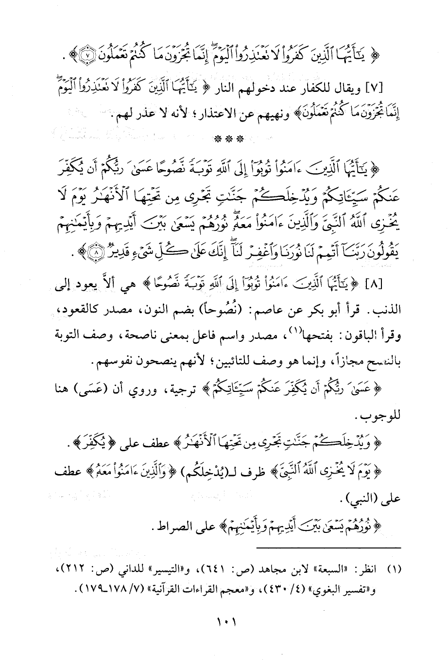 [8] {يَاأَيُّهَا الَّذِينَ آمَنُوا تُوبُوا إِلَى اللَّهِ تَوْبَةً نَصُوحًا} هي ألَّا يعود إلى الذنب. قرأ أبو بكر عن عاصم: (نُصُوحًا) بضم النون، مصدر كالقعود، وقرأ الباقون: بفتحها (¬1)، مصدر واسم فاعل بمعنى ناصحة، وصف التوبة بالنصح مجازًا، وإنما هو وصف للتائبين؛ لأنهم ينصحون نفوسهم.