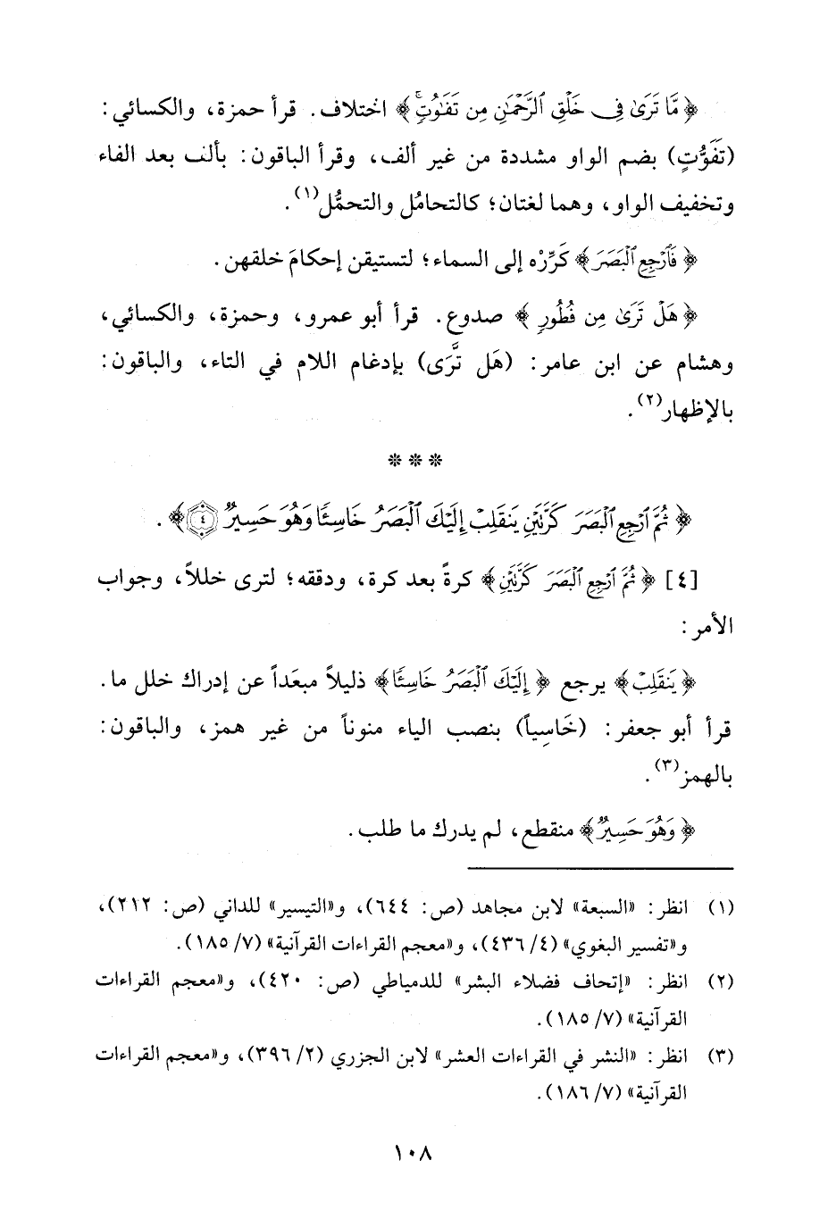 {مَا تَرَى فِي خَلْقِ الرَّحْمَنِ مِنْ تَفَاوُتٍ} اختلاف. قرأ حمزة، والكسائي: (تَفَوُّتٍ) بضم الواو مشددة من غير ألف، وقرأ الباقون: بألف بعد الفاء وتخفيف الواو، وهما لغتان؛ كالتحامُل والتحمُّل (¬1).