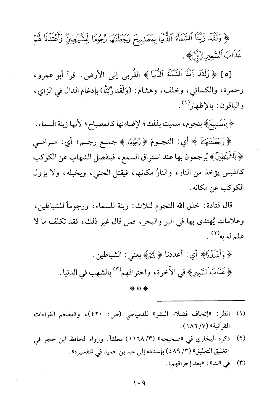 [5] {وَلَقَدْ زَيَّنَّا السَّمَاءَ الدُّنْيَا} القُربى إلى الأرض. قرأ أبو عمرو، وحمزة، والكسائي، وخلف، وهشام: (وَلَقَد زَّيَّنَّا) بإدغام الدال في الزاي، والباقون: بالإظهار (¬1).