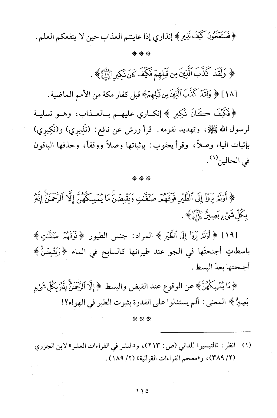 [19] {أَوَلَمْ يَرَوْا إِلَى الطَّيْرِ} المراد: جنس الطيور {فَوْقَهُمْ صَافَّاتٍ} باسطاتٍ أجنحتَها في الجو عند طيرانها كالسابح في الماء {وَيَقْبِضْنَ} أجنحتها بعدَ البسط.