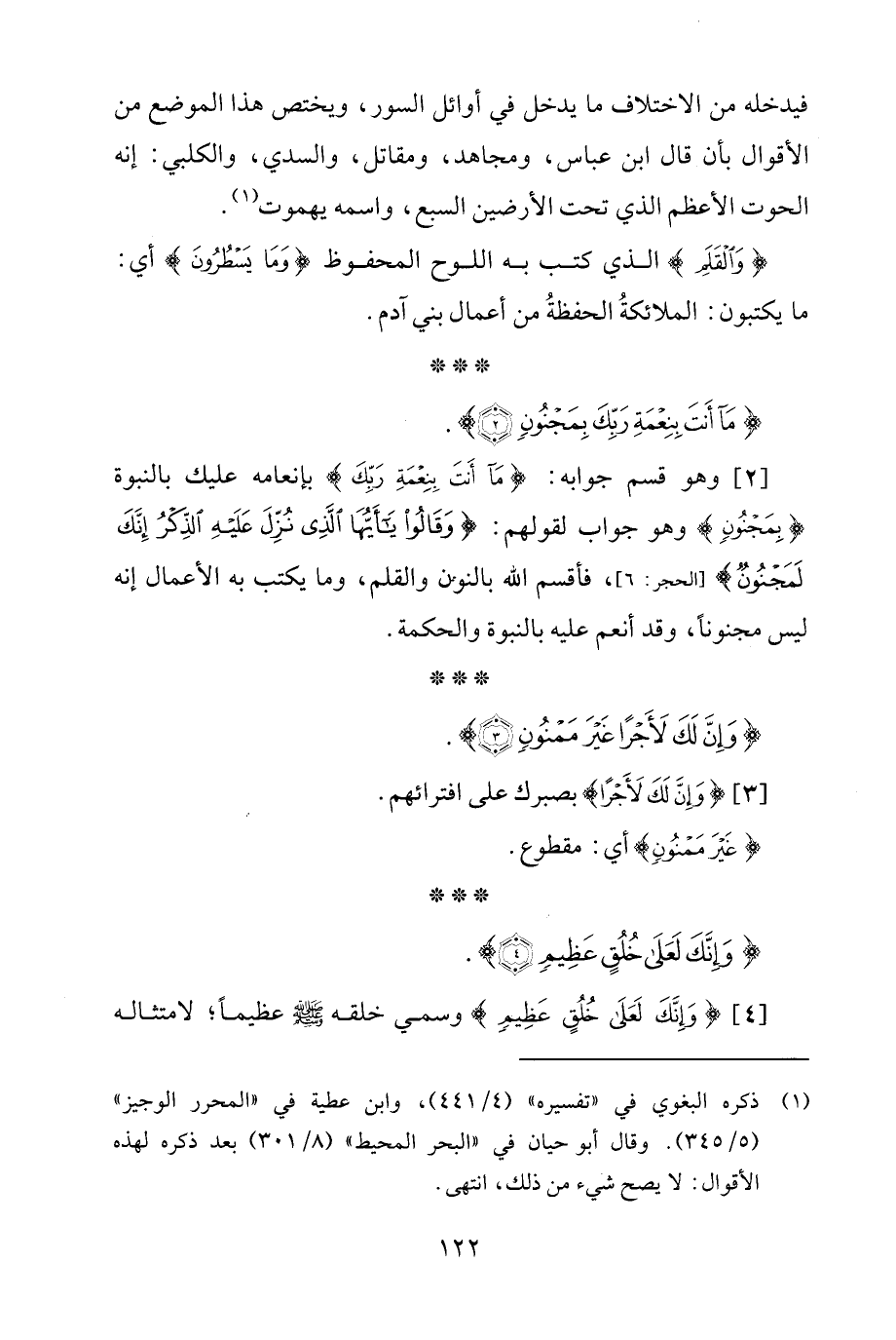 [2] وهو قسم جوابه: {مَا أَنْتَ بِنِعْمَةِ رَبِّكَ} بإنعامه عليك بالنبوة {بِمَجْنُونٍ} وهو جواب لقولهم: {وَقَالُوا يَاأَيُّهَا الَّذِي نُزِّلَ عَلَيْهِ الذِّكْرُ إِنَّكَ لَمَجْنُونٌ} [الحجر: 6]، فأقسم الله بالنون والقلم، وما يكتب به الأعمال إنه ليس مجنونًا، وقد أنعم عليه بالنبوة والحكمة.