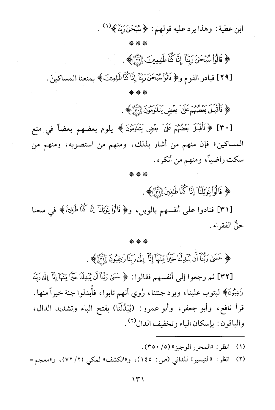 [31] فنادوا على أنفسهم بالويل، و {قَالُوا يَاوَيْلَنَا إِنَّا كُنَّا طَاغِينَ} في منعنا حقَّ الفقراء.