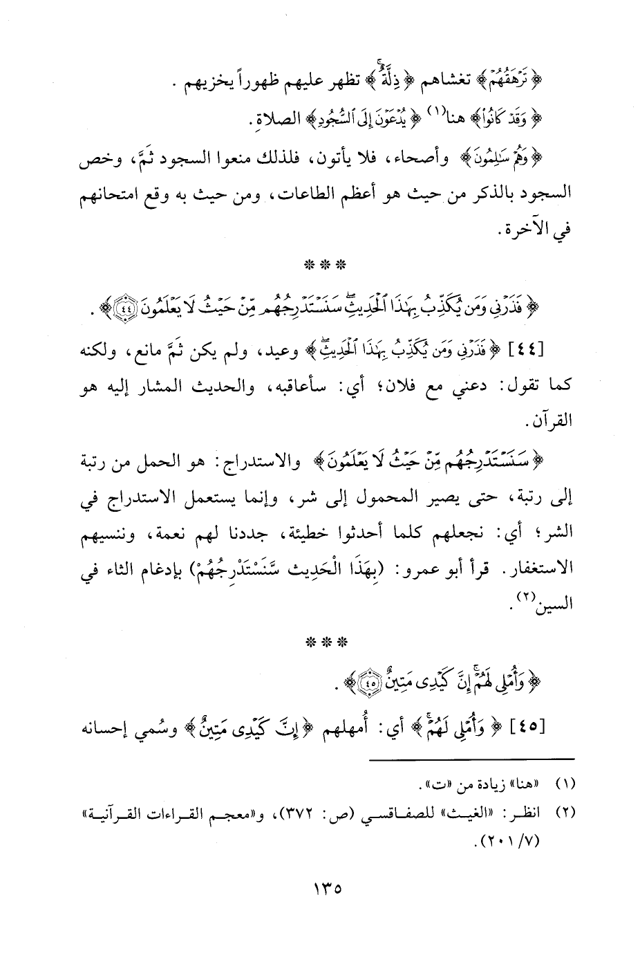 {سَنَسْتَدْرِجُهُمْ مِنْ حَيْثُ لَا يَعْلَمُونَ} والاستدراج: هو الحمل من رتبة إلى رتبة، حتى يصير المحمول إلى شر، وإنما يستعمل الاستدراج في الشر؛ أي: نجعلهم كلما أحدثوا خطيئة، جددنا لهم نعمة، وننسيهم الاستغفار. قرأ أبو عمرو: (بِهَذَا الْحَدِيث سَّنَسْتَدْرِجُهُمْ) بإدغام الثاء في السين (¬2).