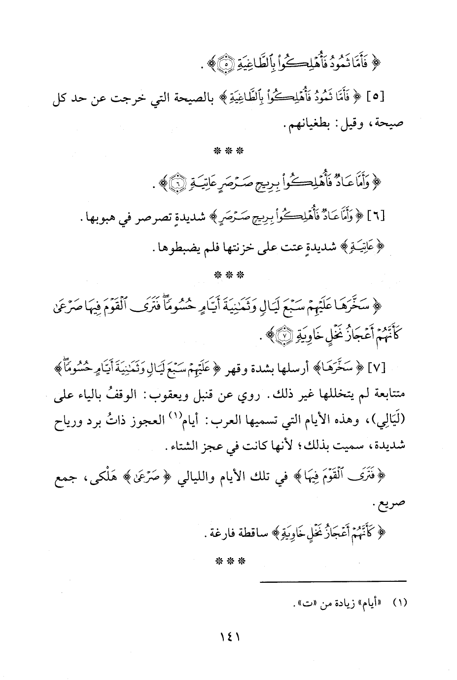 [7] {سَخَّرَهَا} أرسلها بشدة وقهر {عَلَيْهِمْ سَبْعَ لَيَالٍ وَثَمَانِيَةَ أَيَّامٍ حُسُومًا} متتابعة لم يتخللها غير ذلك. روى عن قنبل ويعقوب: الوقفُ بالياء على (لَيَالِي)، وهذه الأيام التي تسميها العرب: أيام (¬1) العجوز ذاتُ برد ورياح شديدة، سميت بذلك؛ لأنها كانت في عجز الشتاء.