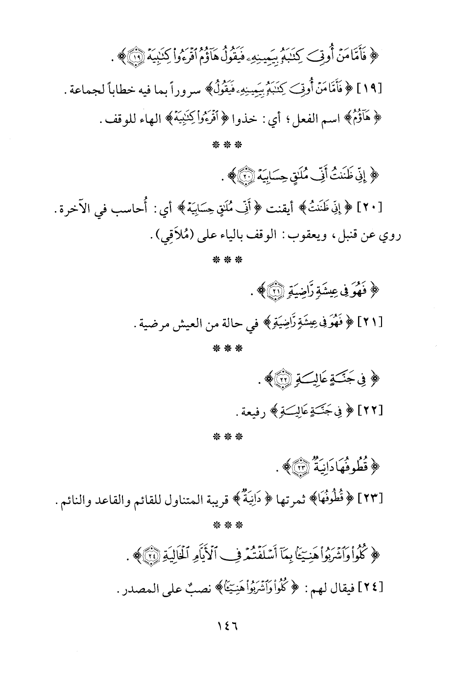 [19] {فَأَمَّا مَنْ أُوتِيَ كِتَابَهُ بِيَمِينِهِ فَيَقُولُ} سرورًا بما فيه خطابًا لجماعة.