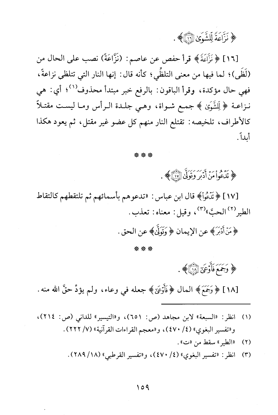 [16] {نَزَّاعَةً} قرأ حفص عن عاصم: (نَزَّاعَةً) نصب على الحال من (لَظَى)؛ لما فيها من معنى التلظِّي؛ كأنه قال: إنها النار التي تتلظى نزاعةً، فهي حال مؤكدة، وقرأ الباقون: بالرفع خبر مبتدأ محذوف (¬1)؛ أي: هي نزاعة {لِلشَّوَى} جمع شواة، وهي جلدة الرأس وما ليست مقتلًا كالأطراف، تلخيصه: تقتلع النار منهم كل عضو غير مقتل، ثم يعود هكذا أبدًا.