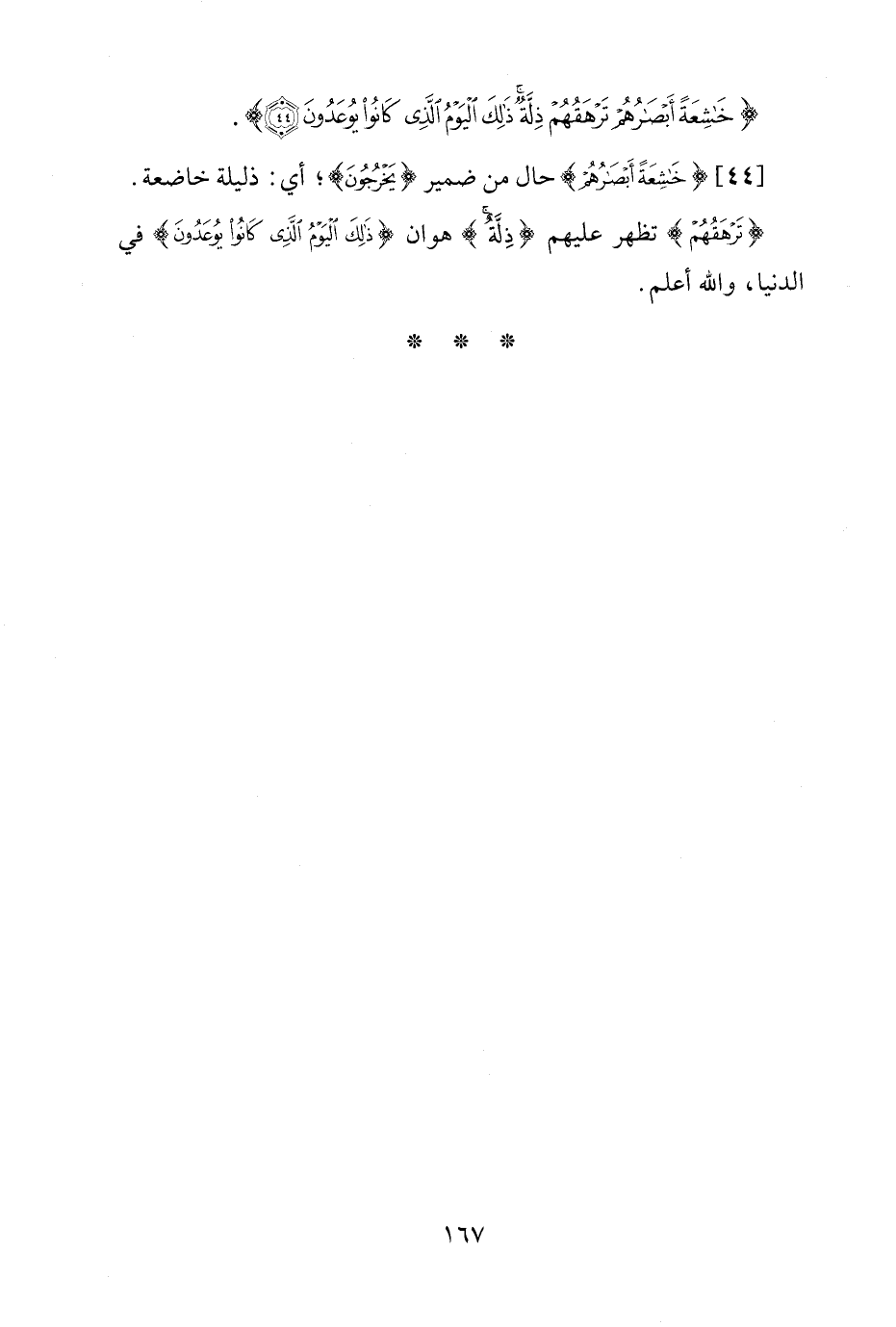 {خَاشِعَةً أَبْصَارُهُمْ تَرْهَقُهُمْ ذِلَّةٌ ذَلِكَ الْيَوْمُ الَّذِي كَانُوا يُوعَدُونَ (44)}.