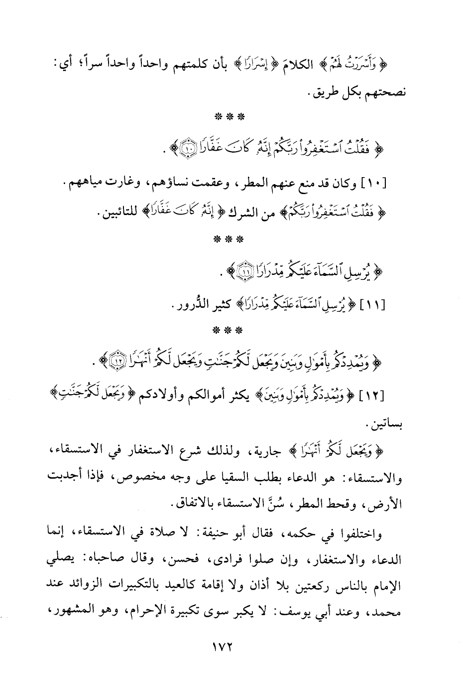 {وَيَجْعَلْ لَكُمْ أَنْهَارًا} جارية، ولذلك شرع الاستغفار في الاستسقاء، والاستسقاء: هو الدعاء بطلب السقيا على وجه مخصوص، فإذا أجدبت الأرض، وقحط المطر، سُنَّ الاستسقاء بالاتفاق.