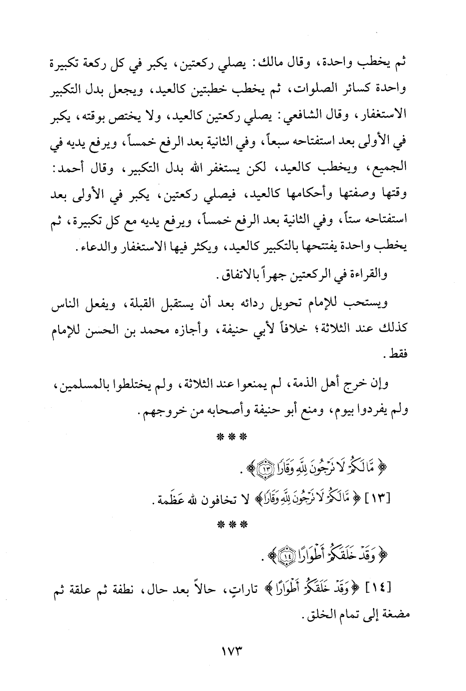 ثم يخطب واحدة، وقال مالك: يصلي ركعتين، يكبر في كل ركعة تكبيرة واحدة كسائر الصلوات، ثم يخطب خطبتين كالعيد، ويجعل بدل التكبير الاستغفار، وقال الشافعي: يصلي ركعتين كالعيد، ولا يختص بوقته، يكبر في الأولى بعد استفتاحه سبعًا، وفي الثانية بعد الرفع خمسًا، ويرفع يديه في الجميع، ويخطب كالعيد، لكن يستغفر الله بدل التكبير، وقال أحمد: وقتها وصفتها وأحكامها كالعيد، فيصلي ركعتين، يكبر في الأولى بعد استفتاحه ستًّا، وفي الثانية بعد الرفع خمسًا، ويرفع يديه مع كل تكبيرة، ثم يخطب واحدة يفتتحها بالتكبير كالعيد، ويكثر فيها الاستغفار والدعاء.
