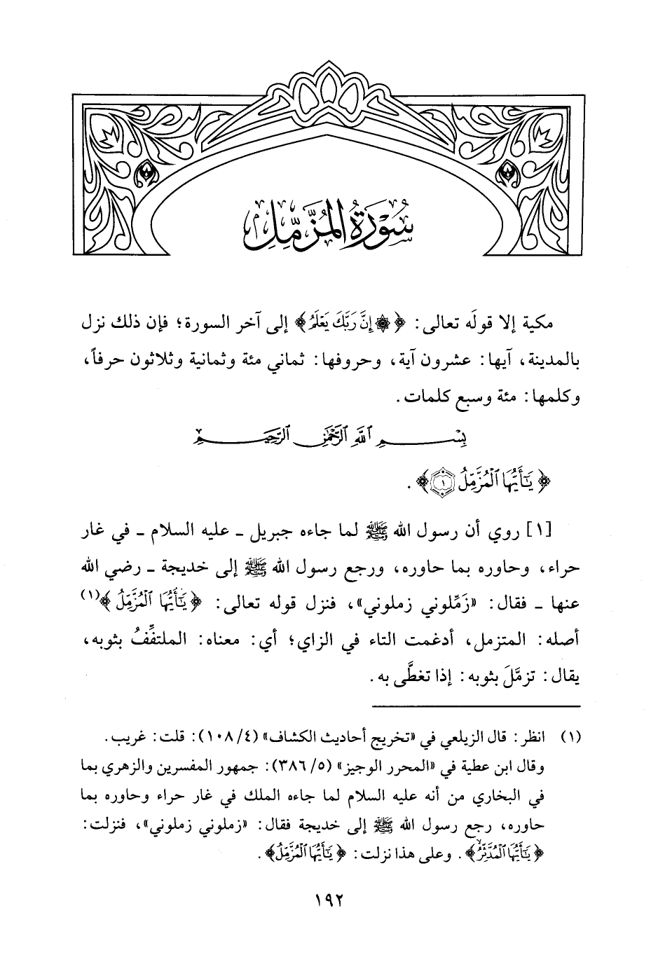[1] روي أن رسول الله - صلى الله عليه وسلم - لما جاءه جبريل -عليه السلام- في غار حراء، وحاوره بما حاوره، ورجع رسول الله - صلى الله عليه وسلم - إلى خديجة -رضي الله عنها- فقال: "زَمِّلوني زملوني"، فنزل قوله تعالى: {يَاأَيُّهَا الْمُزَّمِّلُ} (¬1) أصله: المتزمل، أدغمت التاء في الزاي؛ أي: معناه: الملتقِّفُ بثوبه، يقال: تزمَّلَ بثوبه: إذا تغطَّى به.