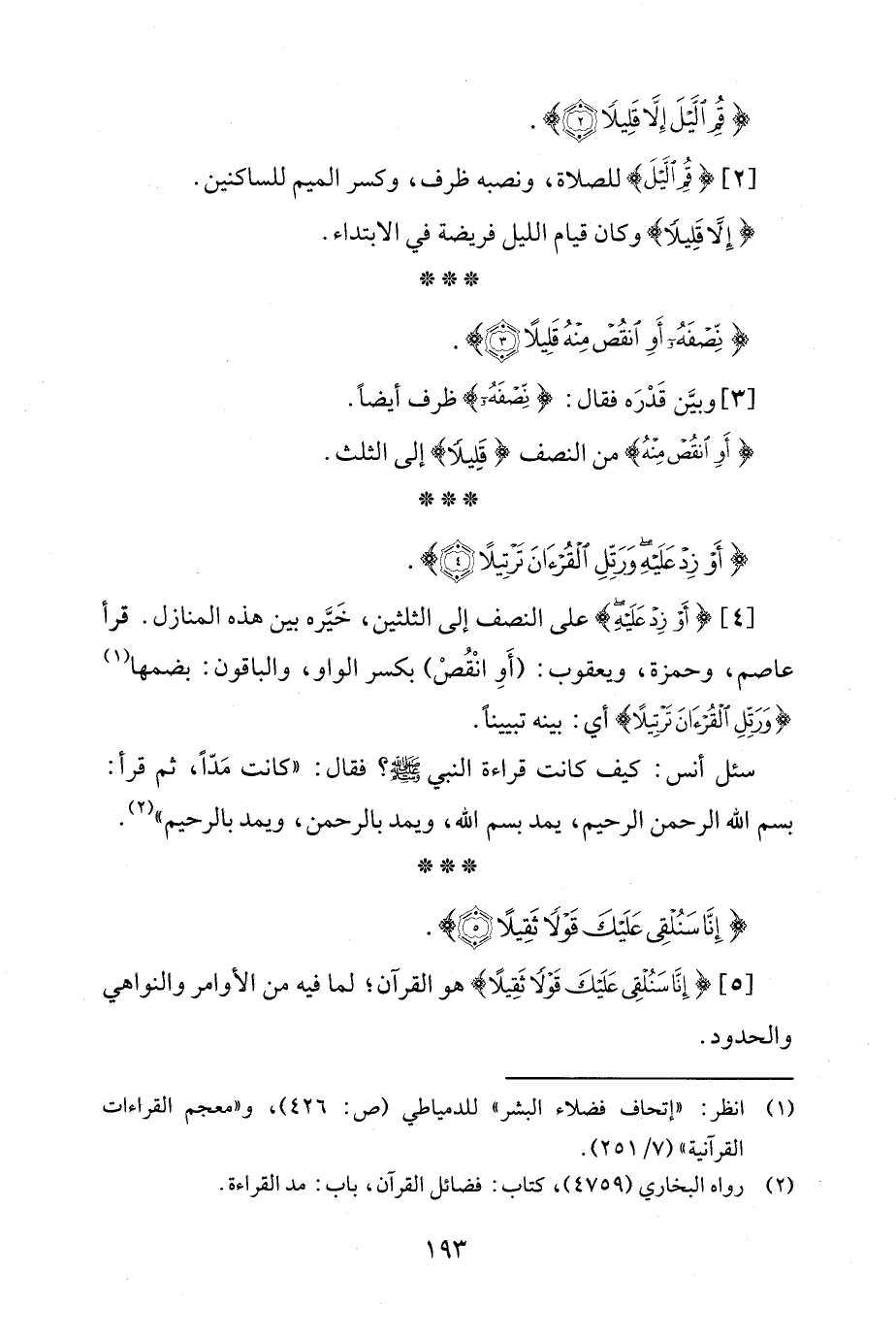 [4] {أَوْ زِدْ عَلَيْهِ} على النصف إلى الثلثين، خَيَّره بين هذه المنازل. قرأ عاصم، وحمزة، ويعقوب: (أَوِ انْقُصْ) بكسر الواو، والباقون: بضمها (¬1) {وَرَتِّلِ الْقُرْآنَ تَرْتِيلًا} أي: بينه تبيينًا.