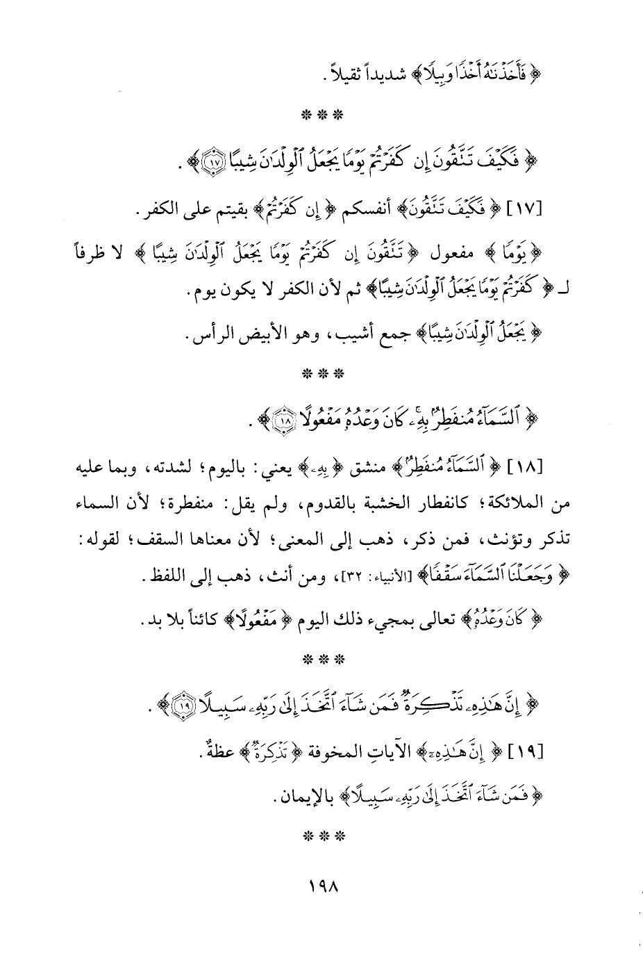 [18] {السَّمَاءُ مُنْفَطِرٌ} منشق {بِهِ} يعني: باليوم؛ لشدته، وبما عليه من الملائكة؛ كانفطار الخشبة بالقدوم، ولم يقل: منفطر؛ لأن السماء تذكر وتؤنث، فمن ذكر، ذهب إلى المعنى؛ لأن معناها السقف؛ لقوله: {وَجَعَلْنَا السَّمَاءَ سَقْفًا} [الأنبياء: 32]، ومن أنث، ذهب إلى اللفظ.