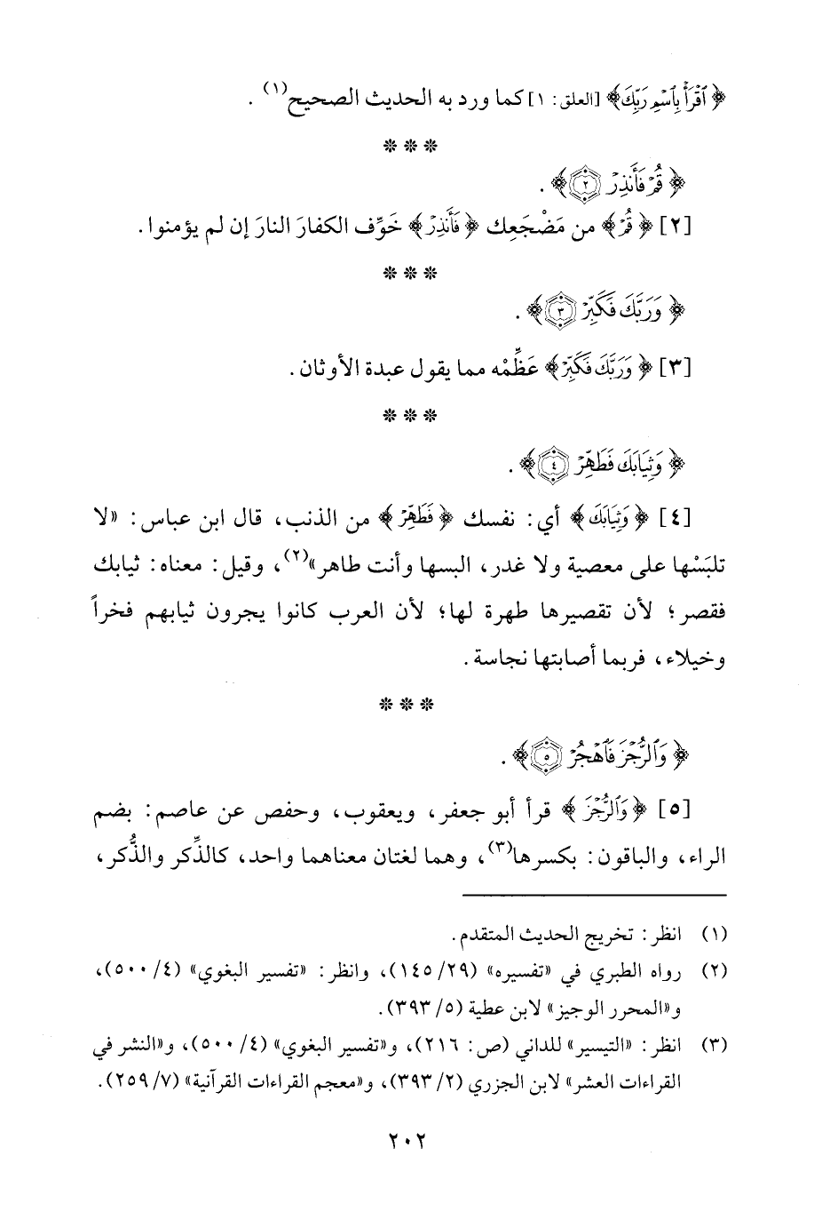[4] {وَثِيَابَكَ} أي: نفسك {فَطَهِّرْ} من الذنب، قال ابن عباس: "لا تلبَسْها على معصية ولا غدر، البسها وأنت طاهر" (¬2)، وقيل: معناه: ثيابك فقصر؛ لأن تقصيرها طهرة لها؛ لأن العرب كانوا يجرون ثيابهم فخرًا وخيلاء، فربما أصابتها نجاسة.
