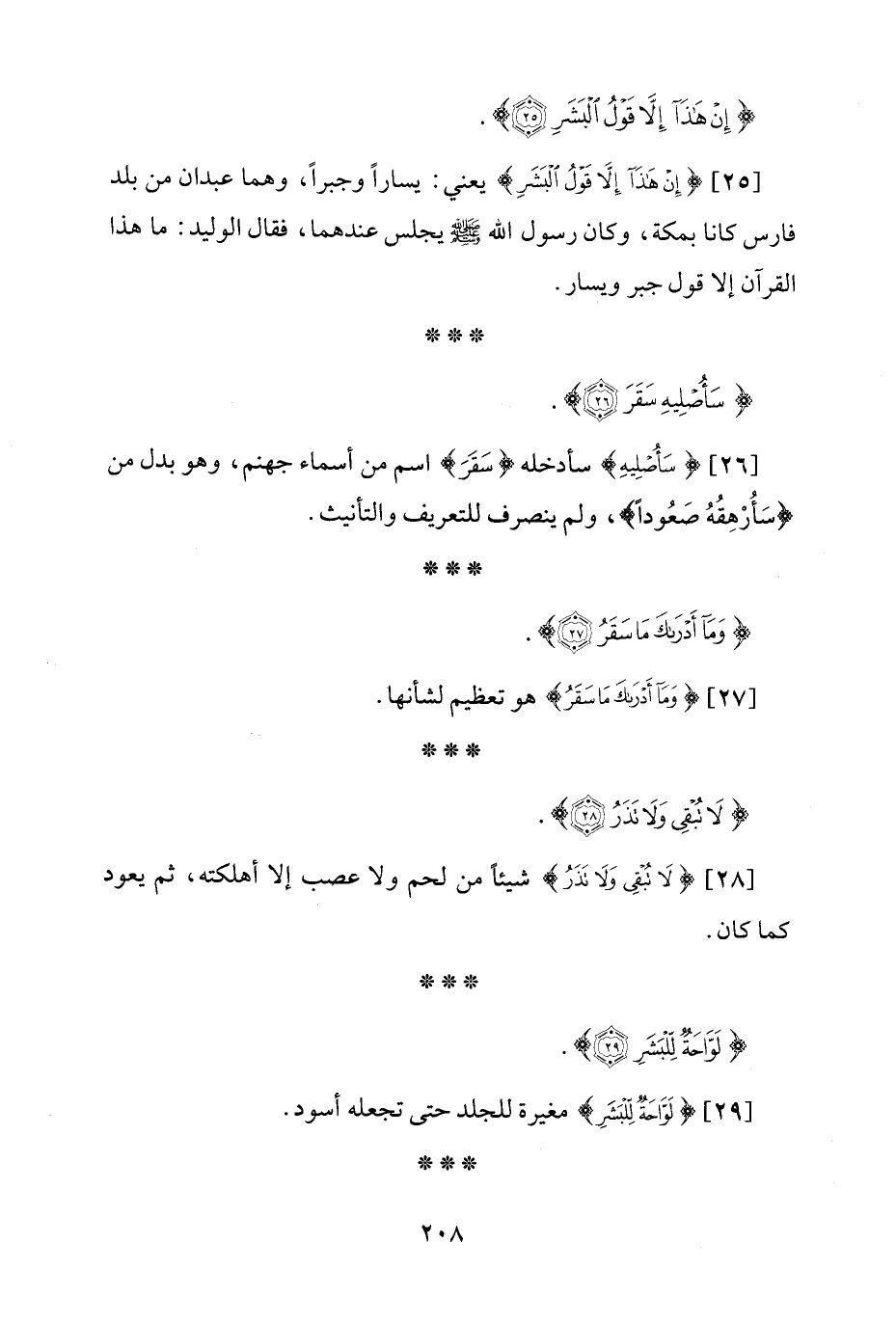 [26] {سَأُصْلِيهِ} سأدخله {سَقَرَ} اسم من أسماء جهنم، وهو بدل من {سَأُرْهِقُهُ صَعُودًا}، ولم ينصرف للتعريف والتأنيث.