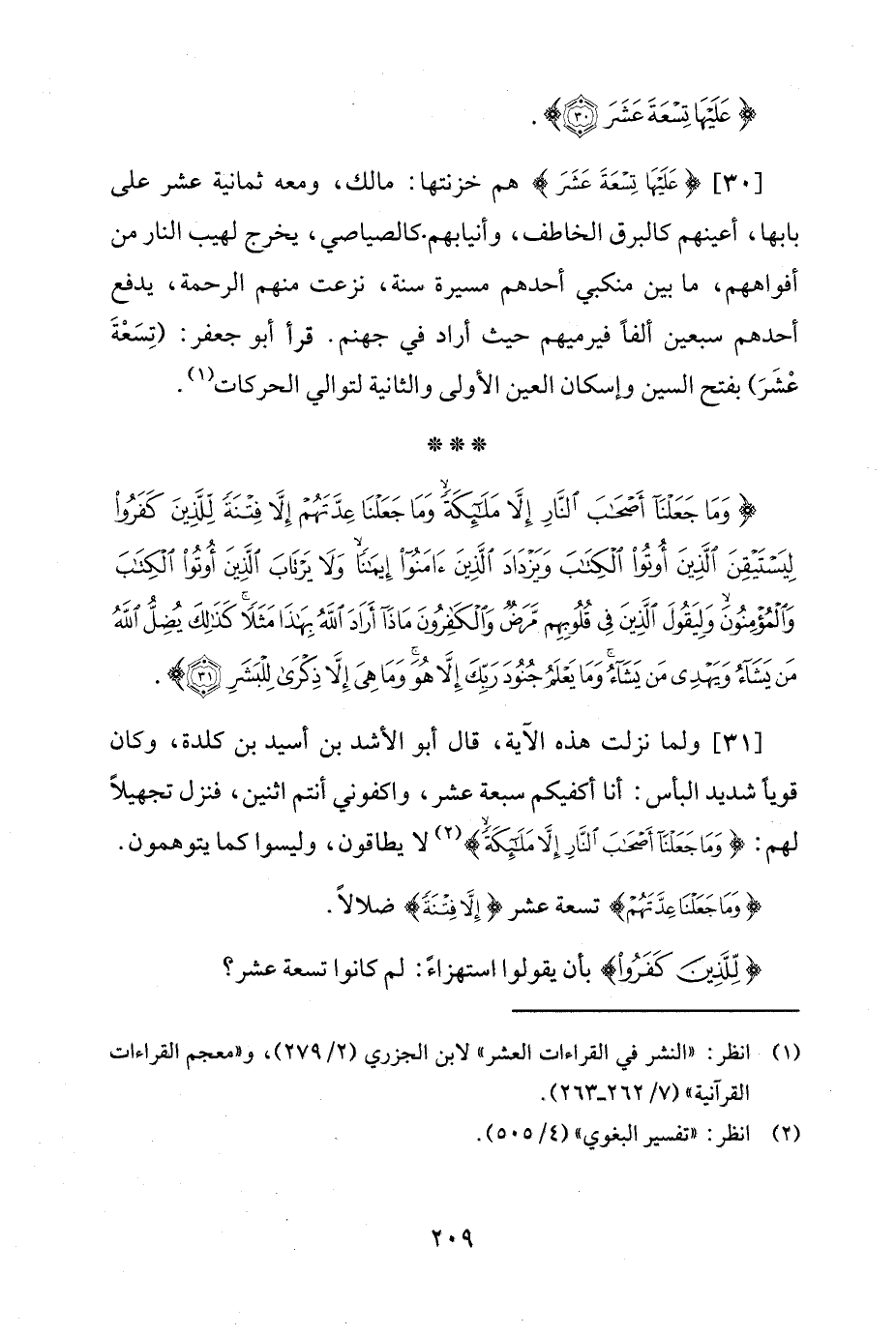 [30] {عَلَيْهَا تِسْعَةَ عَشَرَ} هم خزنتها: مالك، ومعه ثمانية عشر على بابها، أعينهم كالبرق الخاطف، وأنيابهم كالصياصي، يخرج لهيب النار من أفواههم، ما بين منكبي أحدهم مسيرة سنة، نزعت منهم الرحمة، يدفع أحدهم سبعين ألفًا فيرميهم حيث أراد في جهنم. قرأ أبو جعفر: (تِسَعْةَ عْشَرَ) بفتح السين وإسكان العين الأولى والثانية لتوالي الحركات (¬1).
