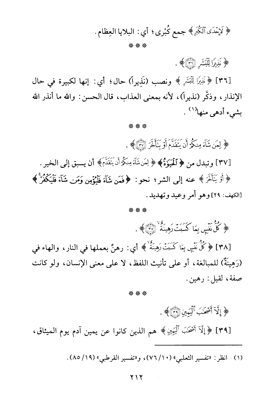 [36] {نَذِيرًا لِلْبَشَرِ} ونصب (نَذِيرًا) حال؛ أي: إنها لكبيرة في حال الإنذار، وذكَّر (نذيرًا)، لأنه بمعنى العذاب، قال الحسن: والله ما أنذر الله بشيء أدهى منها (¬1).