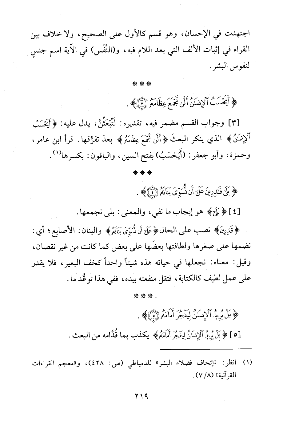 [3] وجواب القسم مضمر فيه، تقديره: لَتُبْعَثُنَّ، يدل عليه: {أَيَحْسَبُ الْإِنْسَانُ} الذي ينكر البعثَ {أَلَّنْ نَجْمَعَ عِظَامَهُ} بعدَ تفرُّقها. قرأ ابن عامر، وحمزة، وأبو جعفر: (أَيَحْسَبُ) بفتح السين، والباقون: بكسرها (¬1).