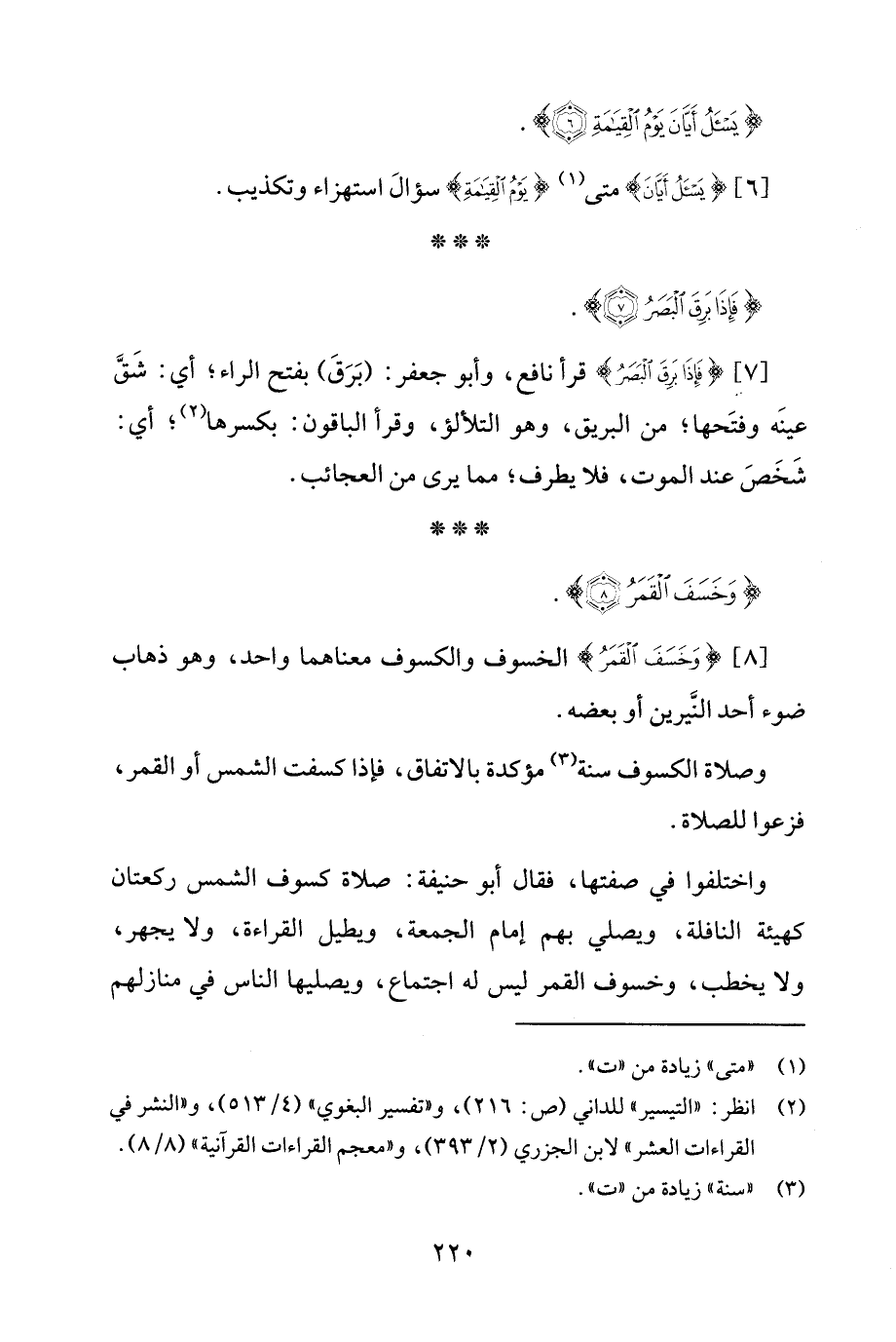 [7] {فَإِذَا بَرِقَ الْبَصَرُ} قرأ نافع، وأبو جعفر: (بَرَقَ) بفتح الراء؛ أي: شَقَّ عينَه وفتَحها؛ من البريق، وهو التلألؤ، وقرأ الباقون: بكسرها (¬2)؛ أي: شَخَصَ عند الموت، فلا يطرف؛ مما يرى من العجائب.