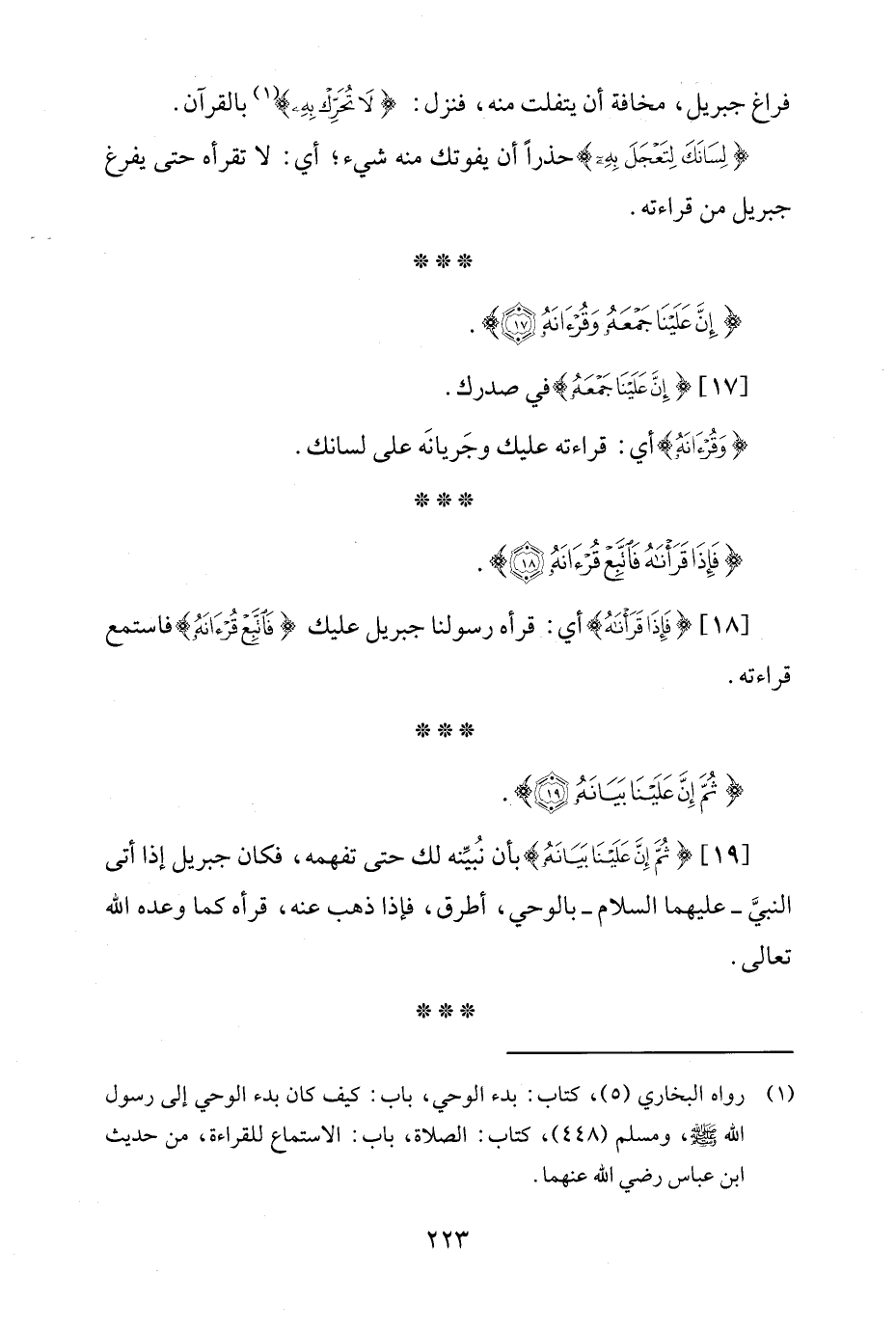 [19] {ثُمَّ إِنَّ عَلَيْنَا بَيَانَهُ} بأن نبُيِّنه لك حتى تفهمه، فكان جبريل إذا أتى النبيَّ -عليهما السلام- بالوحي، أطرق، فإذا ذهب عنه، قرأه كما وعده الله تعالى.