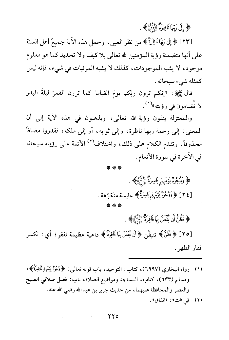 [23] {إِلَى رَبِّهَا نَاظِرَةٌ} من نظر العين، وحمل هذه الآية جميعُ أهل السنة على أنها متضمنة رؤية المؤمنين لله تعالى بلا كيف ولا تحديد كما هو معلوم موجود، لا يشبه الموجودات، كذلك لا يشبه المرئيات في شيء، فإنه ليس كمثله شيء سبحانه.