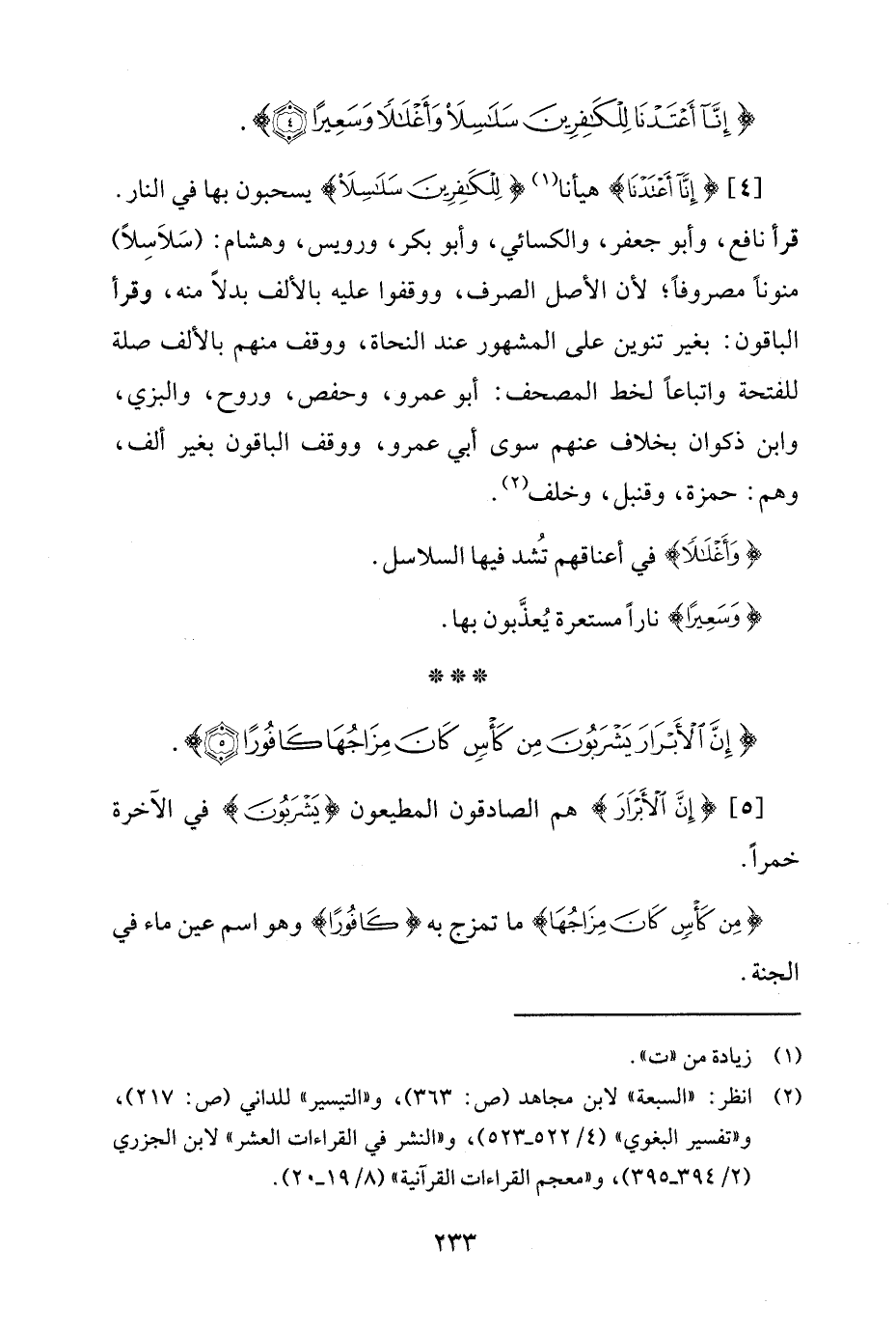 قرأ نافع، وأبو جعفر، والكسائي، وأبو بكر، ورويس، وهشام: (سَلاَسِلًا) منونًا مصروفًا؛ لأن الأصل الصرف، ووقفوا عليه بالألف بدلًا منه، وقرأ الباقون: بغير تنوين على المشهور عند النحاة، ووقف منهم بالألف صلة للفتحة واتباعًا لخط المصحف: أبو عمرو، وحفص، وروح، والبزي، وابن ذكوان بخلاف عنهم سوى أبي عمرو، ووقف الباقون بغير ألف، وهم: حمزة، وقنبل، وخلف (¬2).