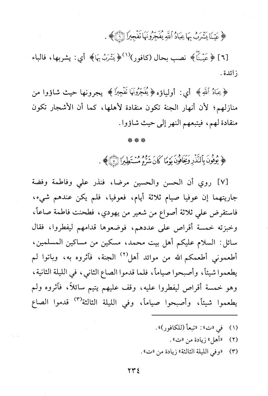 [7] روي أن الحسن والحسين مرضا، فنذر علي وفاطمة وفضة جاريتهما إن عوفيا صيام ثلاثة أيام، فعوفيا، فلم يكن عندهم شيء، فاستقرض علي ثلاثة أصواع من شعير من يهودي، فطحنت فاطمة صاعًا، وخبزته خمسة أقراص على عددهم، فوضعوها قدامهم ليفطروا، فقال سائل: السلام عليكم أهل بيت محمد، مسكين من مساكين المسلمين، أطعموني أطعمكم الله من موائد أهل (¬2) الجنة، فآثروه به، وباتوا لم يطعموا شيئًا، وأصبحوا صيامًا، فلما قدموا الصاع الثاني، في الليلة الثانية، وهو خمسة أقراص ليفطروا عليه، وقف عليهم يتيم سائلًا، فآثروه ولم يطعموا شيئًا، وأصبحوا صيامًا، وفي الليلة الثالثة (¬3) قدموا الصاع