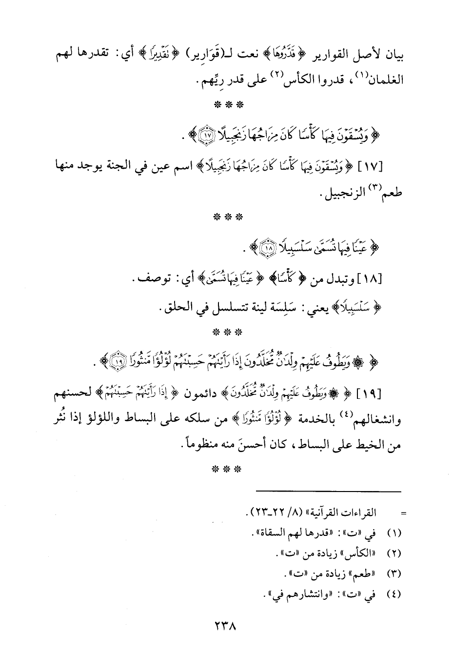 [19] {وَيَطُوفُ عَلَيْهِمْ وِلْدَانٌ مُخَلَّدُونَ} دائمون {إِذَا رَأَيْتَهُمْ حَسِبْتَهُمْ} لحسنهم وانشغالهم (¬4) بالخدمة {لُؤْلُؤًا مَنْثُورًا} من سلكه على البساط واللؤلؤ إذا نُثر من الخيط على البساط، كان أحسنَ منه منظومًا.