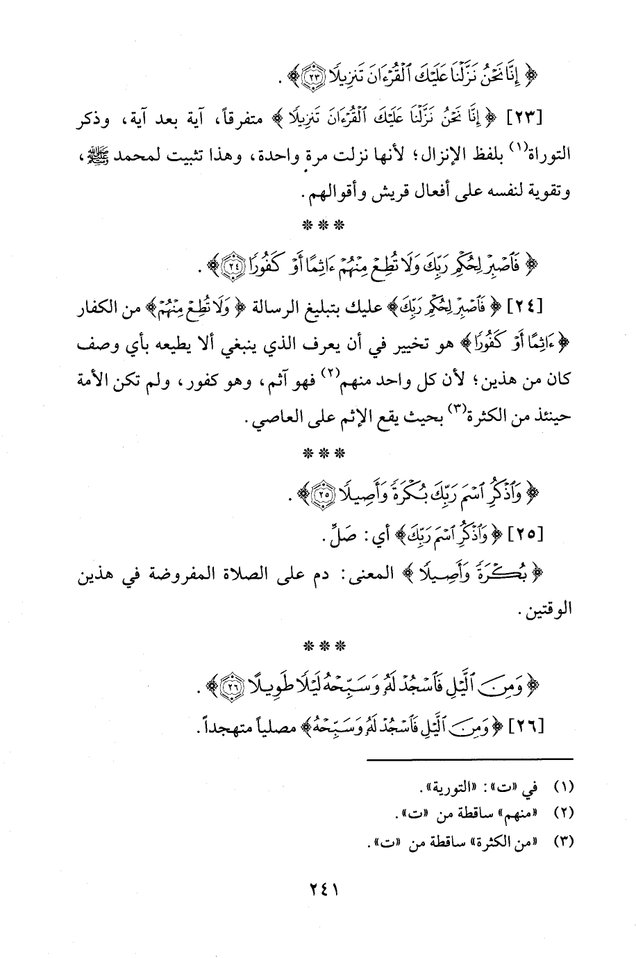 [23] {إِنَّا نَحْنُ نَزَّلْنَا عَلَيْكَ الْقُرْآنَ تَنْزِيلًا} متفرقًا، آية بعد آية، وذكر التوراة (¬1) بلفظ الإنزال؛ لأنها نزلت مرة واحدة، وهذا تثبيت لمحمد - صلى الله عليه وسلم -، وتقوية لنفسه على أفعال قريش وأقوالهم.