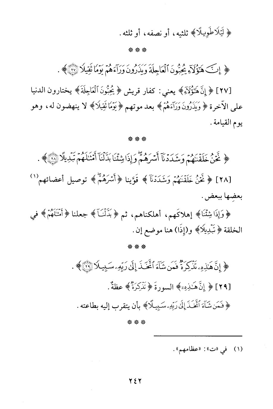 [28] {نَحْنُ خَلَقْنَاهُمْ وَشَدَدْنَا} قَوَّينا {أَسْرَهُمْ} توصيل أعضائهم (¬1) بعضِها ببعض.