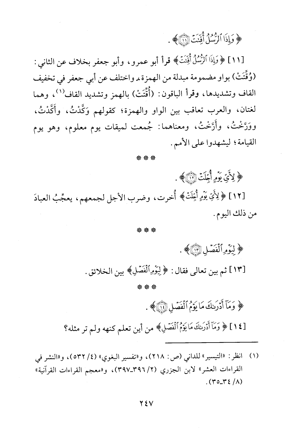 [11] {وَإِذَا الرُّسُلُ أُقِّتَتْ} قرأ أبو عمرو، وأبو جعفر بخلاف عن الثاني: (وُقِّتَتْ) بواو مضمومة مبدلة من الهمزة, واختلف عن أبي جعفر في تخفيف القاف وتشديدها، وقرأ الباقون: (أُقِّتَتْ) بالهمز وتشديد القاف (¬1)، وهما لغتان، والعرب تعاقب بين الواو والهمزة؛ كقولهم وَكَّدْتُ، وأَكَّدْتُ، ووَرَّخْتُ، وأَرَّخْتُ، ومعناهما: جُمعت لميقات يوم معلوم، وهو يوم القيامة؛ ليشهدوا على الأمم.