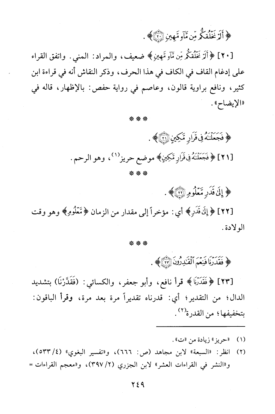 [20] {أَلَمْ نَخْلُقْكُمْ مِنْ مَاءٍ مَهِينٍ} ضعيف، والمراد: المني. واتفق القراء على إدغام القاف في الكاف في هذا الحرف، وذكر النقاش أنه في قراءة ابن كثير، ونافع براوية قالون، وعاصم في رواية حفص: بالإظهار، قاله في "الإيضاح".