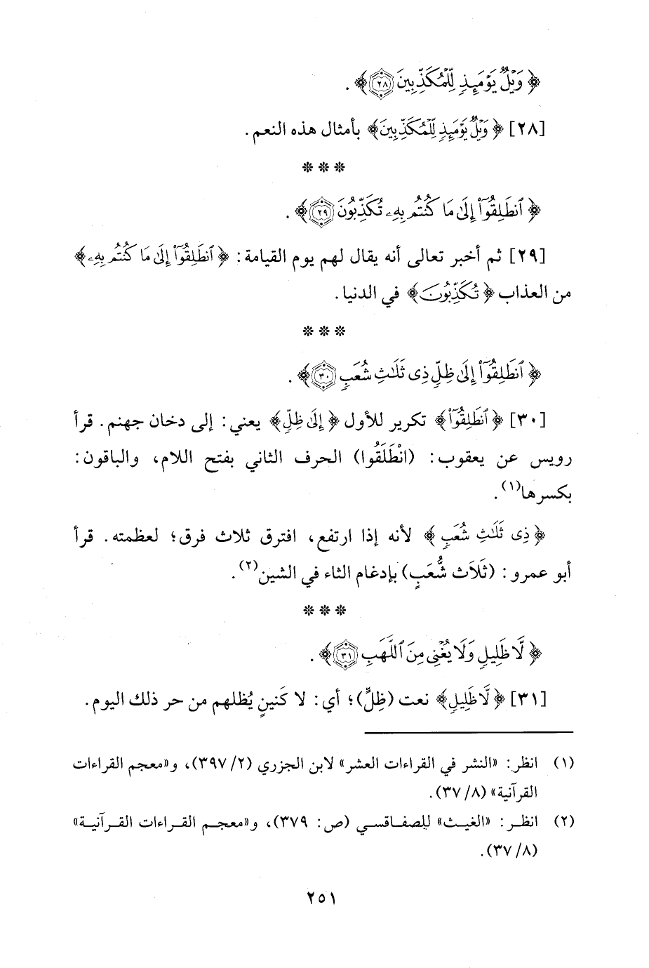 [30] {انْطَلِقُوا} تكرير للأول {إِلَى ظِلٍّ} يعني: إلى دخان جهنم. قرأ رويس عن يعقوب: (انْطَلَقُوا) الحرف الثاني بفتح اللام، والباقون: بكسرها (¬1).