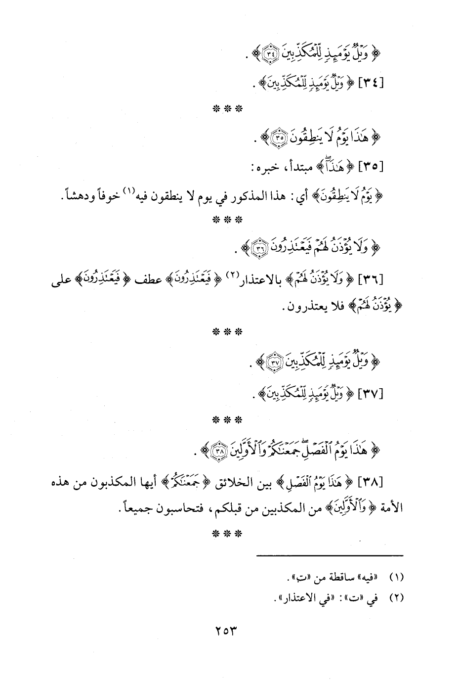 [36] {وَلَا يُؤْذَنُ لَهُمْ} بالاعتذار (¬2) {فَيَعْتَذِرُونَ} عطف {فَيَعْتَذِرُونَ} على {يُؤْذَنُ لَهُمْ} فلا يعتذرون.