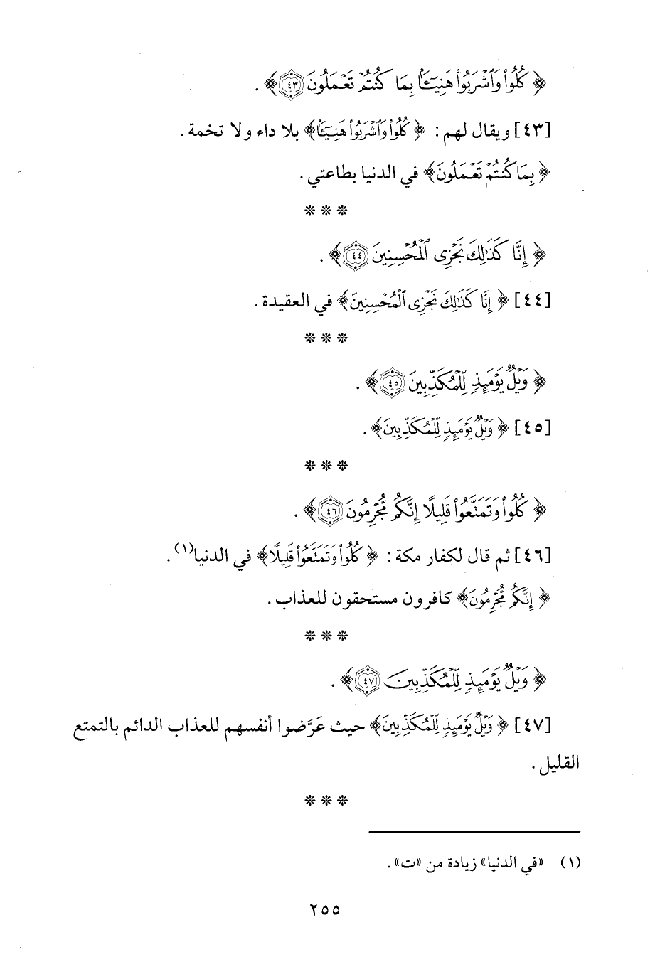 [47] {وَيْلٌ يَوْمَئِذٍ لِلْمُكَذِّبِينَ} حيث عَرَّضوا أنفسهم للعذاب الدائم بالتمتع القليل.