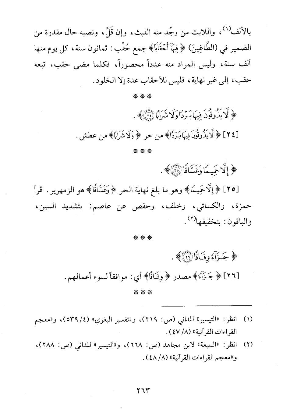 [25] {إِلَّا حَمِيمًا} وهو ما بلغ نهاية الحر {وَغَسَّاقًا} هو الزمهرير. قرأ حمزة، والكسائي، وخلف، وحفص عن عاصم: بتشديد السين، والباقون: بتخفيفها (¬2).