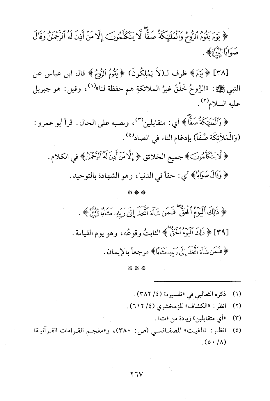 [38] {يَوْمَ} ظرف لـ (لاَ يَمْلِكُونَ) {يَقُومُ الرُّوحُ} قال ابن عباس عن النبي - صلى الله عليه وسلم -: "الرُّوحُ خَلْقٌ غيرُ الملائكةِ هم حفظة لنا" (¬1)، وقيل: هو جبريل عليه السلام (¬2).
