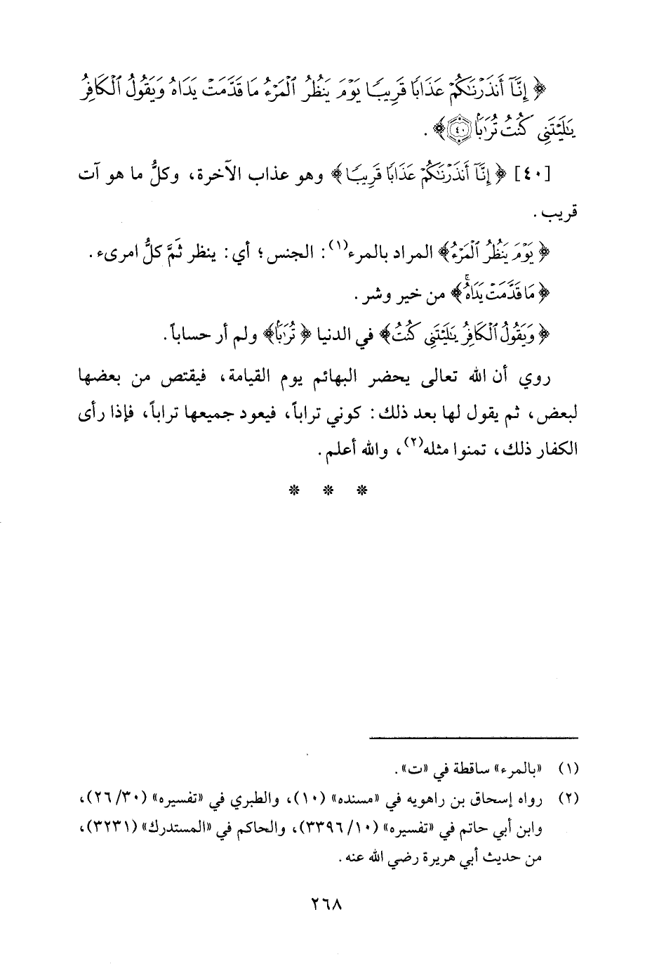روي أن الله تعالى يحضر البهائم يوم القيامة، فيقتص من بعضها لبعض، ثم يقول لها بعد ذلك: كوني ترابًا، فيعود جميعها ترابًا، فإذا رأى الكفار ذلك، تمنوا مثله (¬2)، والله أعلم.