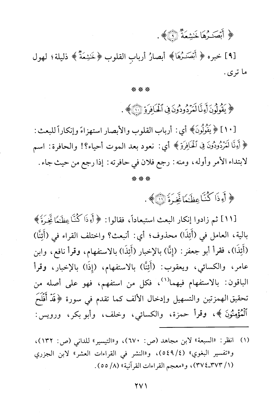 [10] {يَقُولُونَ} أي: أرباب القلوب والأبصار استهزاءً وإنكارًا للبعث: {أَإِنَّا لَمَرْدُودُونَ فِي الْحَافِرَةِ} أي: نعود بعد الموت أحياء؟! والحافرة: اسم لابتداء الأمر وأوله، ومنه: رجع فلان في حافرته: إذا رجع من حيث جاء.