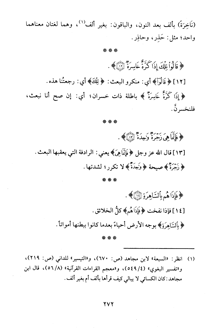 [13] قال الله عز وجل {فَإِنَّمَا هِيَ} يعني: الرادفة التي يعقبها البعث.