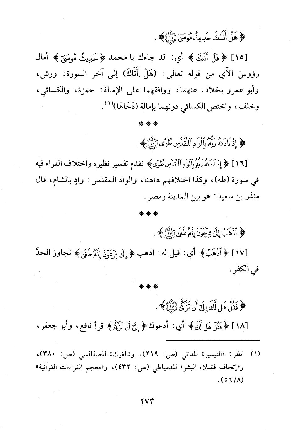 [15] {هَلْ أَتَاكَ} أي: قد جاءك يا محمد {حَدِيثُ مُوسَى} أمال رؤوسَ الآي من قوله تعالى: (هَلْ أَتَاكَ) إلى آخر السورة: ورش، وأبو عمرو بخلاف عنهما، ووافقهما على الإمالة: حمزة، والكسائي، وخلف، واختص الكسائي دونهما بإمالة (دَحَاهَا) (¬1).