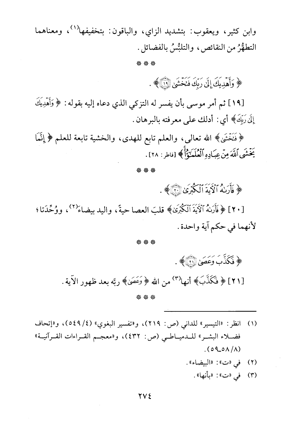 [19] ثم أمر موسى بأن يفسر له التزكي الذي دعاه إليه بقوله: {وَأَهْدِيَكَ إِلَى رَبِّكَ} أي: أدلك على معرفته بالبرهان.