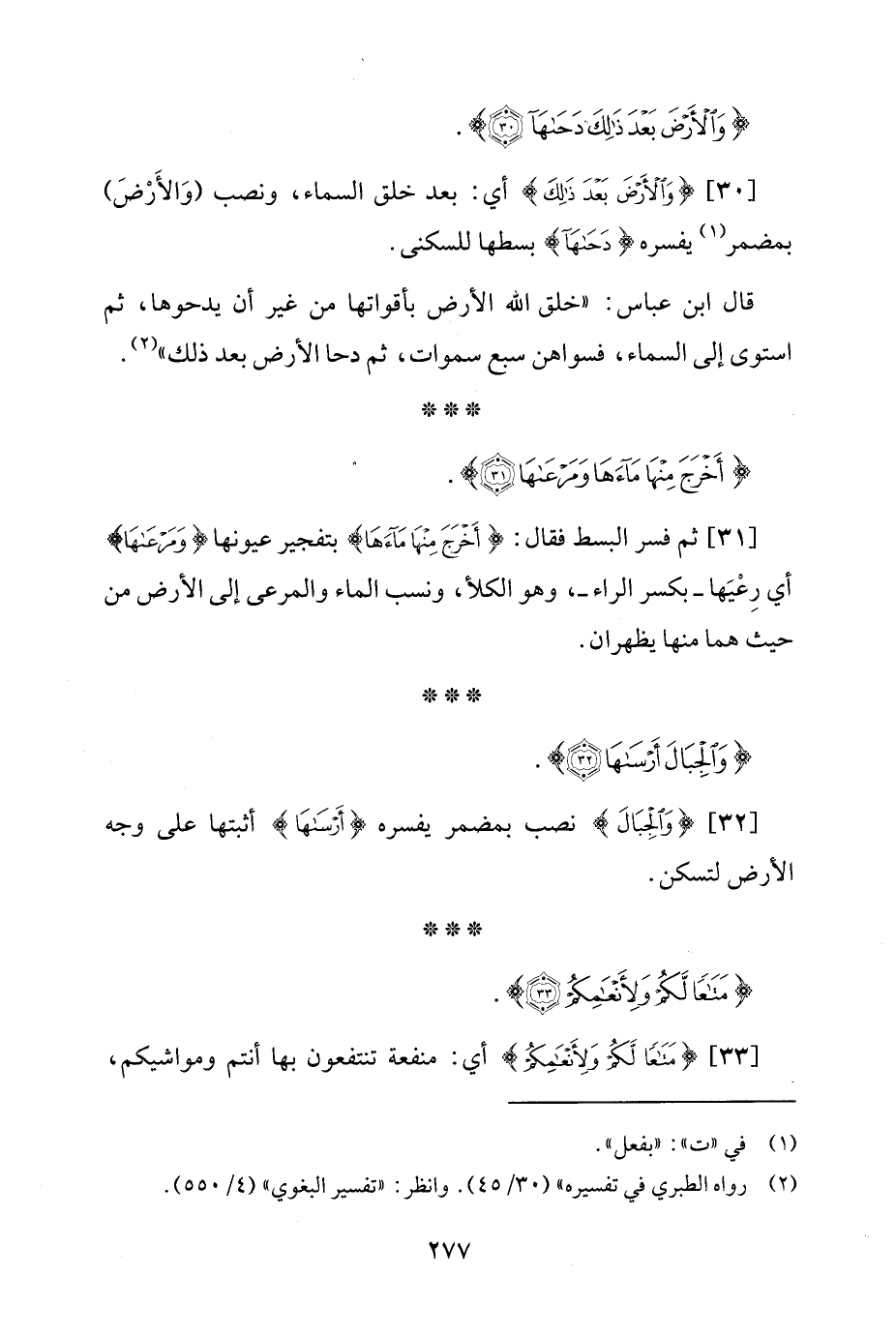 [31] ثم فسر البسط فقال: {أَخْرَجَ مِنْهَا مَاءَهَا} بتفجير عيونها {وَمَرْعَاهَا} أي رِعْيَها -بكسر الراء-، وهو الكلأ، ونسب الماء والمرعى إلى الأرض من حيث هما منها يظهران.