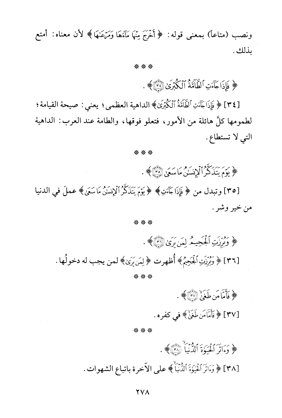 [34] {فَإِذَا جَاءَتِ الطَّامَّةُ الْكُبْرَى} الداهية العظمى؛ يعني: صيحة القيامة؛ لطمومها كلَّ هائلة من الأمور، فتعلو فوقها، والطامة عند العرب: الداهية التي لا تستطاع.