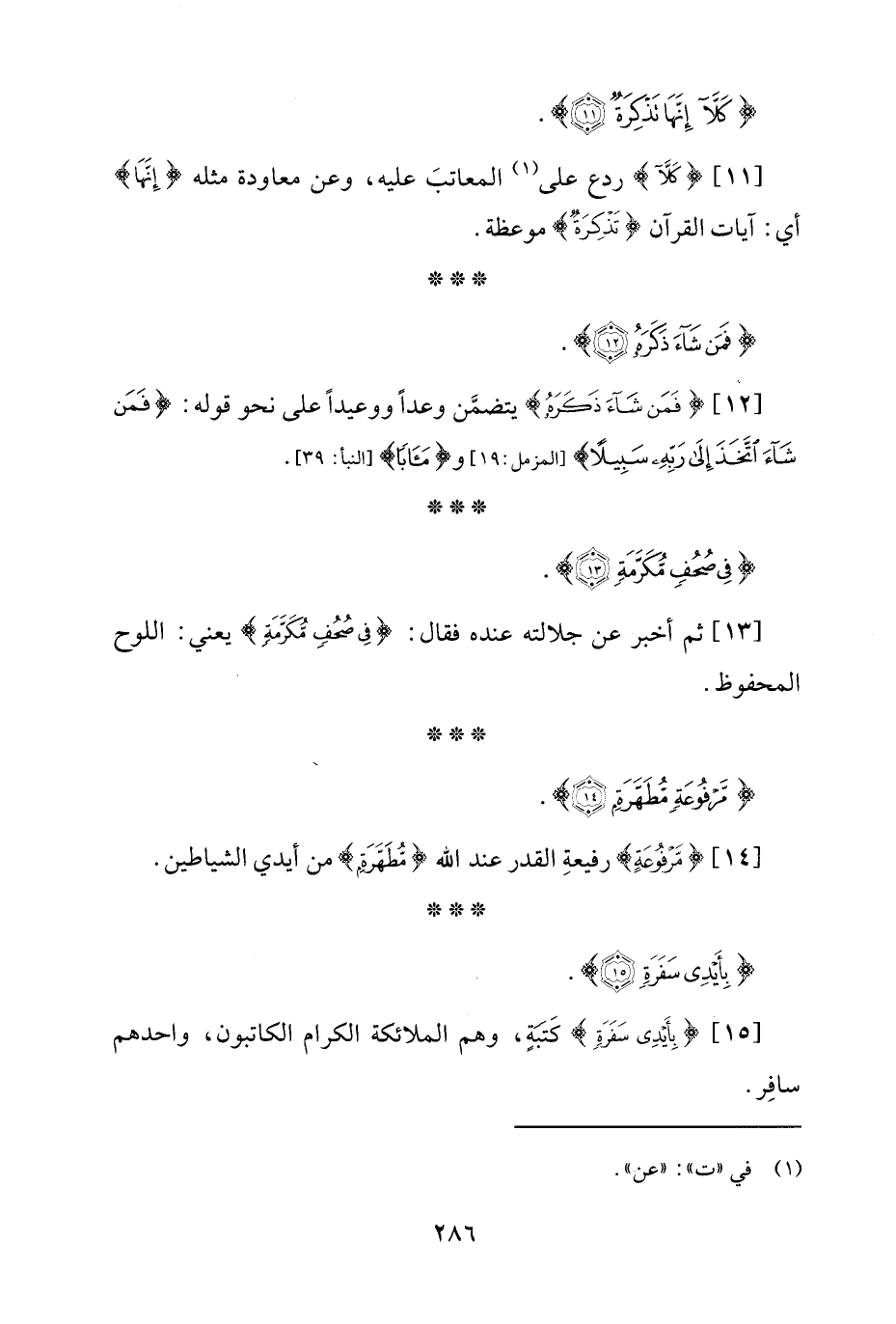 [15] {بِأَيْدِي سَفَرَةٍ} كَتبَةٍ، وهم الملائكة الكرام الكاتبون، واحدهم سافِر.